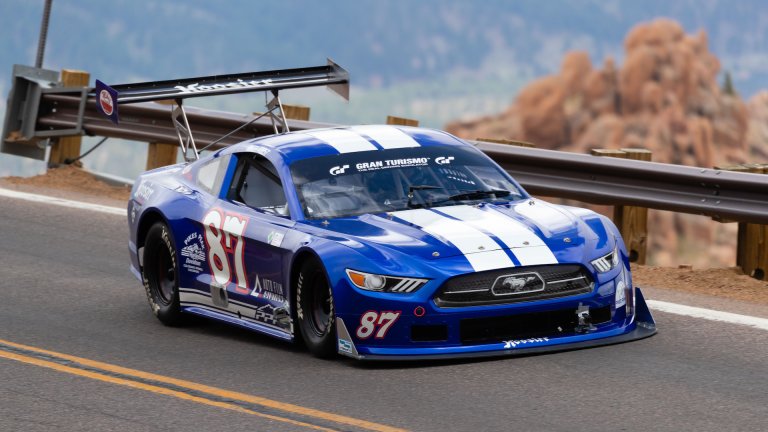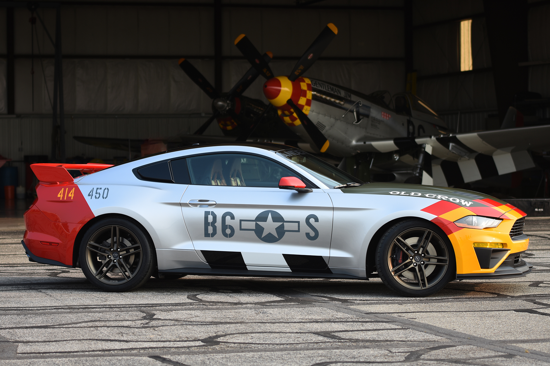 For instance, the body gets a custom paint theme with unique badging that matches the exterior of Col. Anderson’s actual P-51. A Roush rear bumper and Ford Performance lower front racing spoiler complement the unique exterior, along with a custom exhaust with blue-rainbow-tinted exhaust tips that mimic the ones found on P-51s. The hood also gains two front vents that simulate the heat vents from the fighter.