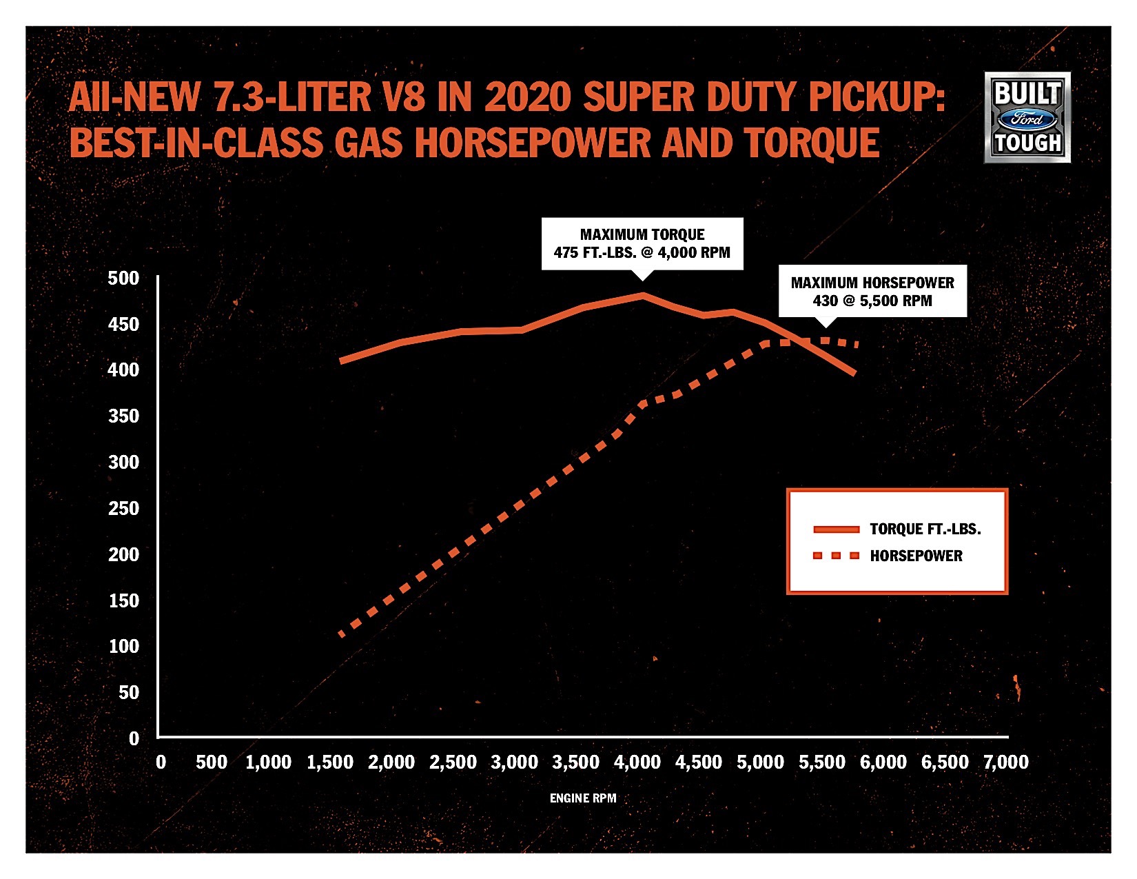 The 7.3-liter V8 makes 430 horsepower at 5,000 RPM and 475 pound-feet of torque at 4,000 RPM. In chassis cab applications, where the 7.3-liter is offered dyno-certified, those figures are measured at 350 horsepower and 468 pound-feet.