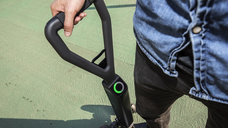The batteries and electronics are also localized to the steering handle on the front of the scooter. Riders can accelerate and brake by twisting the grip in the center of the handlebar, and can check the scooter’s charge by glancing at a central charge ring.