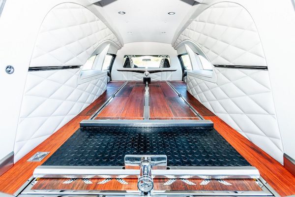 Nevertheless, after reportedly adapting manufacturing techniques from the aerospace industry, the Tesla held together, allowing Naley and crew to start the newly constructed fiberglass body. With the car, at last, looking like a hearse, it now had to function as one, so that meant partitioning the front seats from the cargo area, installing equipment to secure coffins and bedecking the rear in fineries you’d want for your loved ones. White leather, dark wood, and polished metal.