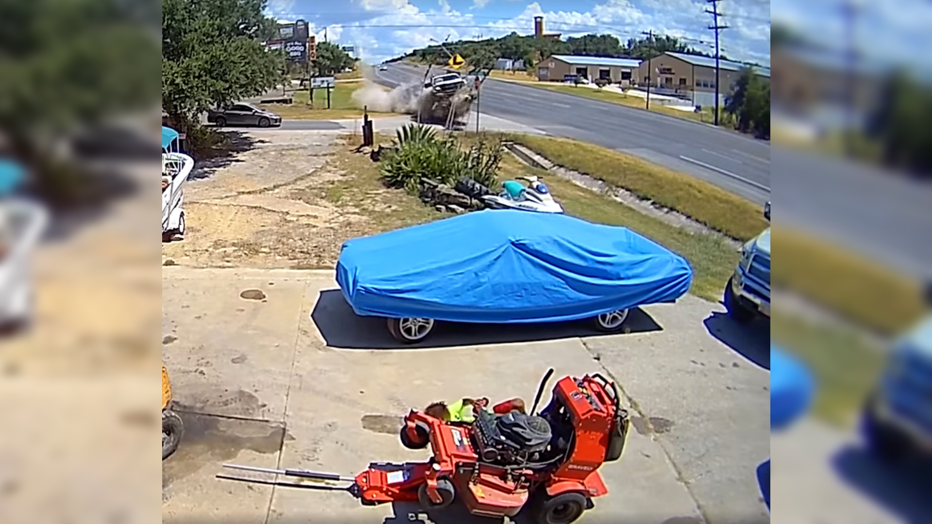 Imagine working in your yard when a pickup truck hauling a trailer catapults into the air at speed, nearly taking you, your car, and everything else out in a flurry of metal, rubber, and noise. That’s exactly what happened recently in the rural Texas town of Spicewood, just northeast of Austin, and it was all caught on video.