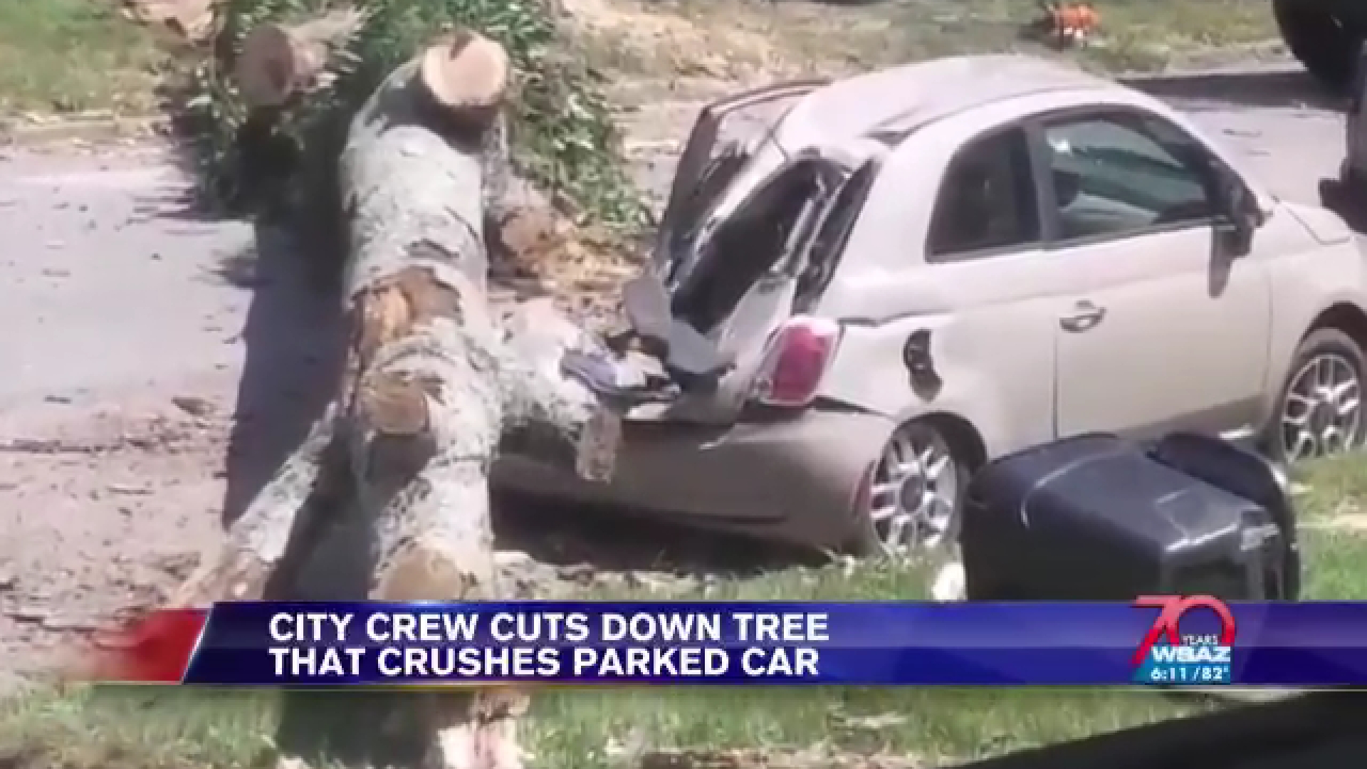It appears the tree was not done with vehicular destruction because when the city workers cut the thing down, it landed right on top of the Fiat city car that was parked nearby and owned by a female Marshall University student.