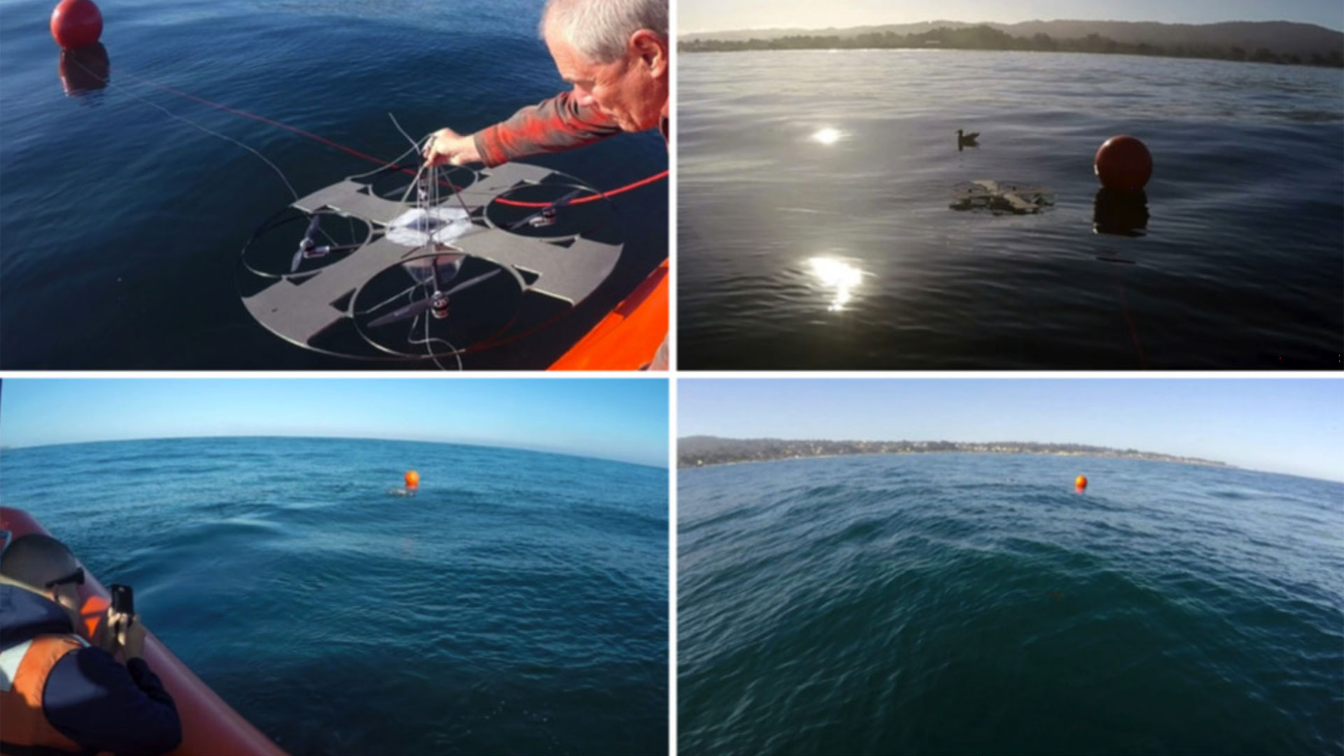 The seven-pound Aqua-Quad prototype isn’t built to spend time underwater. It pairs the functions of an ocean drifter – a buoy, for all intents – with a drone. The salient feature is its flight system, four carbon fiber rotors set inside a ring about 3.5 feet in diameter. In between the rotors are crossbars covered with 20 photovoltaic cells, gathering solar energy as the only source of power for the battery housed in the watertight cylinder below.