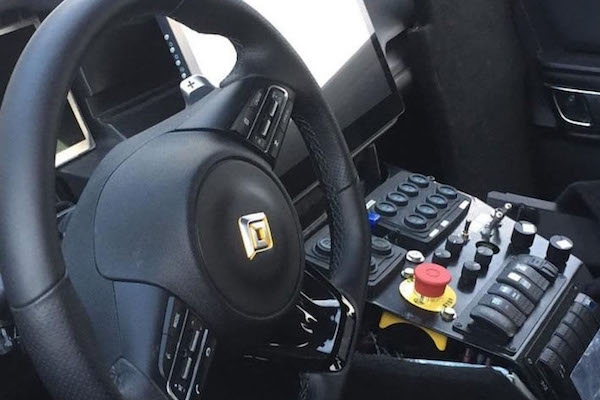 Only a single photo of the R1T’s interior—fitted in the never-before-seen Black Mountain color scheme—was taken. It largely matches that of the R1T concept, minus the panel of buttons between the seats, and a never-before-seen steering wheel, with buttons galore and a rounded airbag cover, as opposed to the concept’s more angular cover. A Rivian spokesperson told The Drive that the interior and steering wheel depicted in this photo are not representative of final production spec, suggesting that the quadrangular airbag cover could be retained on series-produced R1Ts.