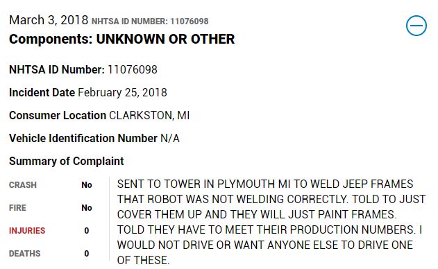 One particular complaint referenced in the NHTSA investigation report is “11076098.” This complaint appears to be from an individual who claims to have been contacted to repair or manufacturer frames for Jeep vehicles at “Tower in Plymouth, MI”. In the report, the individual states that they were instructed to cover up the welds so that they could be painted over.
