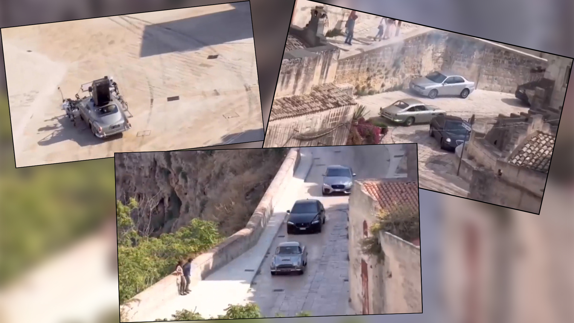 A spy video was recently posted to Facebook showing a massive chase scene with James Bond’s classic Aston Martin DB5 getting driven hard in the quiet coastal town of Matera, Italy. The scenes show the vintage Aston being pursued by a pair of villainous Jaguar XF sedans and a few motorcycles.