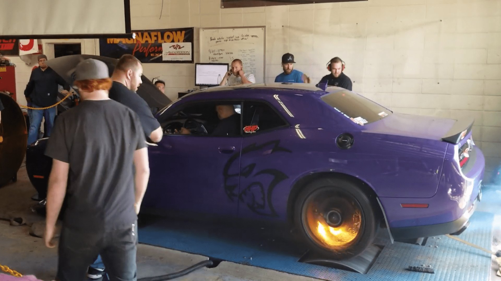 Regardless, when the straps broke and the Challenger was set loose, it started to slide sideways on the dyno. With the rear wheels hurling the car straight but going out of line, it looks like it caused the brake calipers to rub with the wheels and catch on fire.