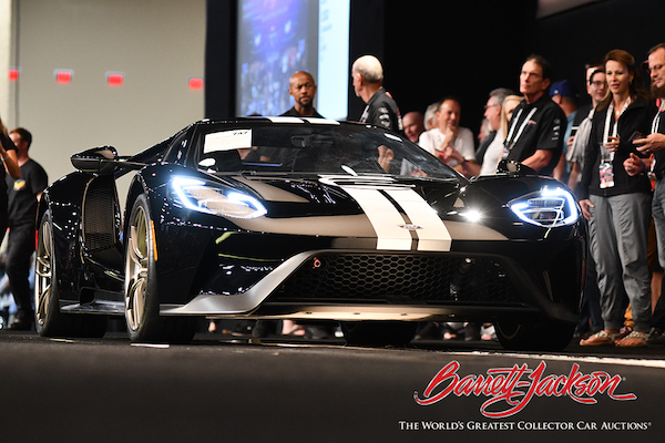The car in question was a limited-run ’66 Heritage Edition model, bearing a livery copied from the Chris Amon- and Bruce McLaren-driven GT40 that led a one-two-three finish for Ford at the 1966 24 Hours of Le Mans. It was signed on the auction block by Joey Hand, who captained a Ford GT to a historic class win at Le Mans in 2016.