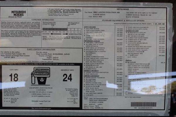 , South Coast MitsubishiWith that in mind, it’s obvious why the manual, all-time all-wheel-drive Evo was a hit with the tuning and racing communities, which have since blown up, crashed, or otherwise ruined most good Evos out there. Such a rarity is a stock, unmodified Evo that Road and Track reported in 2017 on the sale of a nine-mile Evo IX by Californian dealer South Coast Mitsubishi for $138,000, or over $100,000 more than its original sticker price of $35,814. That dealership—which reportedly overstocked itself on Evo IXs with the intent of selling them for insane profits—is the one that now lists this car for sale at $75,999, or more than double the $35,189 price listed on the car’s window sticker.