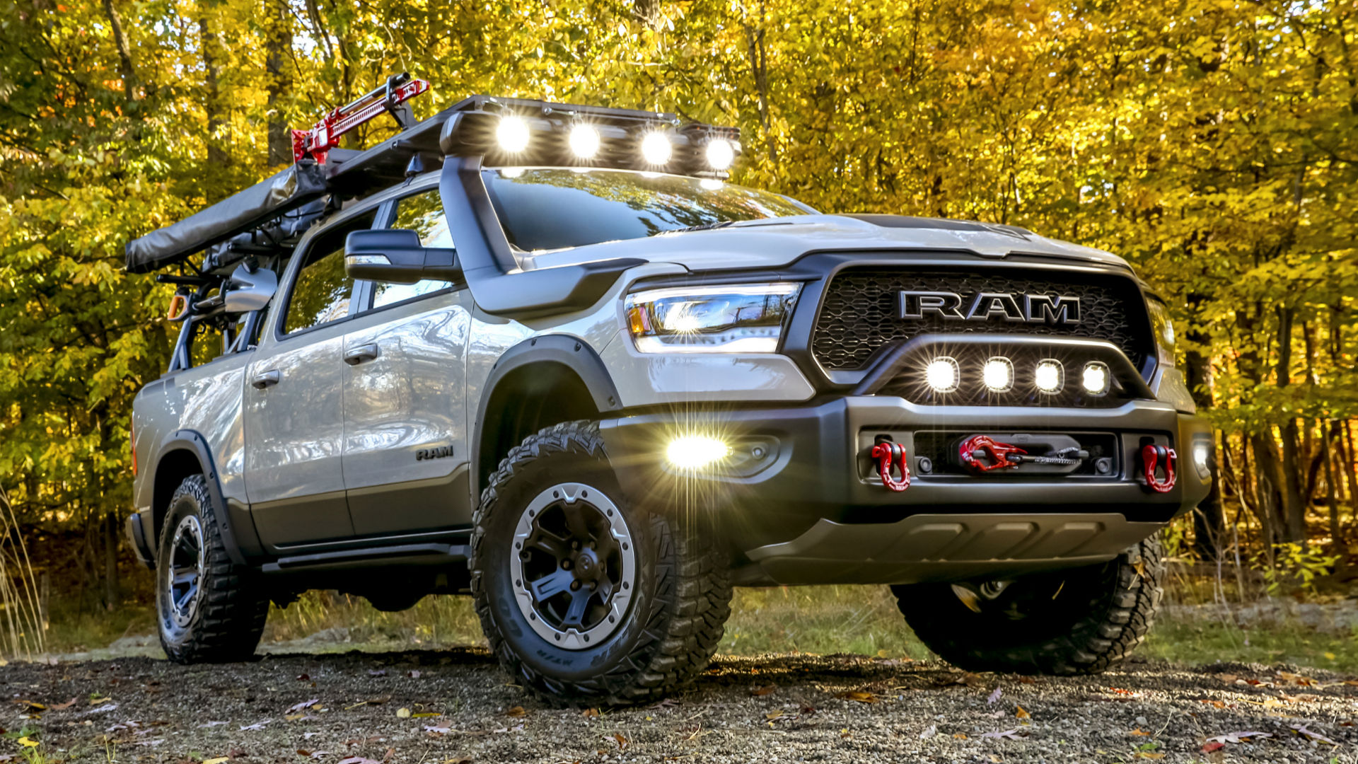 The Rebel OTG’s exterior is where you’ll find the modifications, though, as it’s had a lengthy list of gear added to make it both more adept and convenient when unplugging from workaday life. A concept two-inch suspension lift gives extra clearance for the 35-inch Goodyear tires, which are mounted to beadlock wheels. A snorkel intake improves its water-fording ability, while rock rails give extra protection to the truck’s doors and rocker panels. All of this will help with going further in the wilderness, but should the pickup get stuck on an obstacle, it’s also got a Mopar concept front bumper with an integrated winch; a one-off rear bumper based on a Ram 1500 Tradesman unit provides a better departure angle as well.