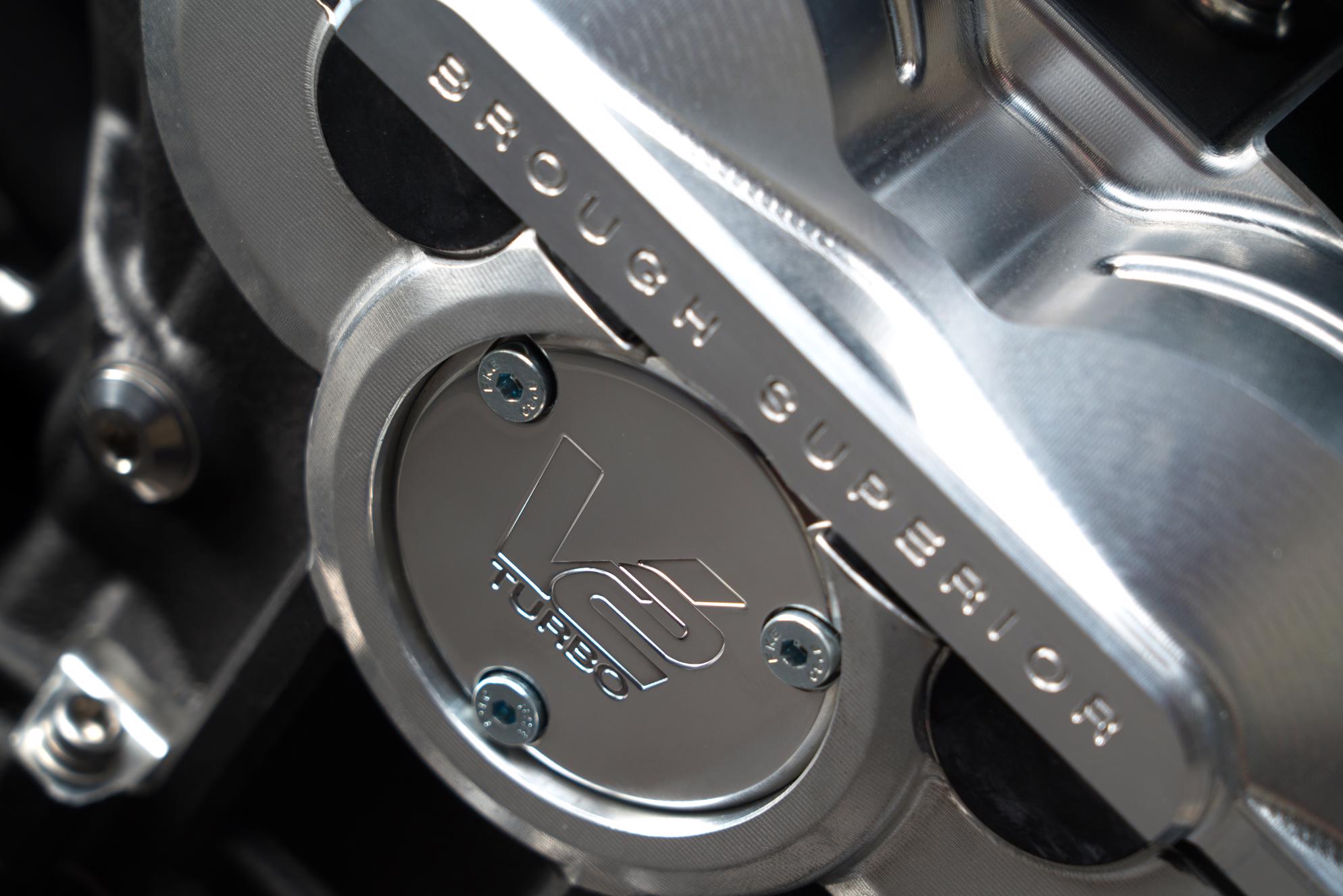 At the AMB 001’s core is a turbocharged 997cc V-twin engine, the first in Brough Superior’s history. There’s a semi-dry crankcase, a 6-speed sequential manual transmission with APTC clutch, and sends power to the rear wheel, via a proper chain. The turbocharger is a variable geometry unit that reduces lag completely. An Inconel exhaust completes the package. All in, the boosted V-twin motor puts down 180 horsepower.