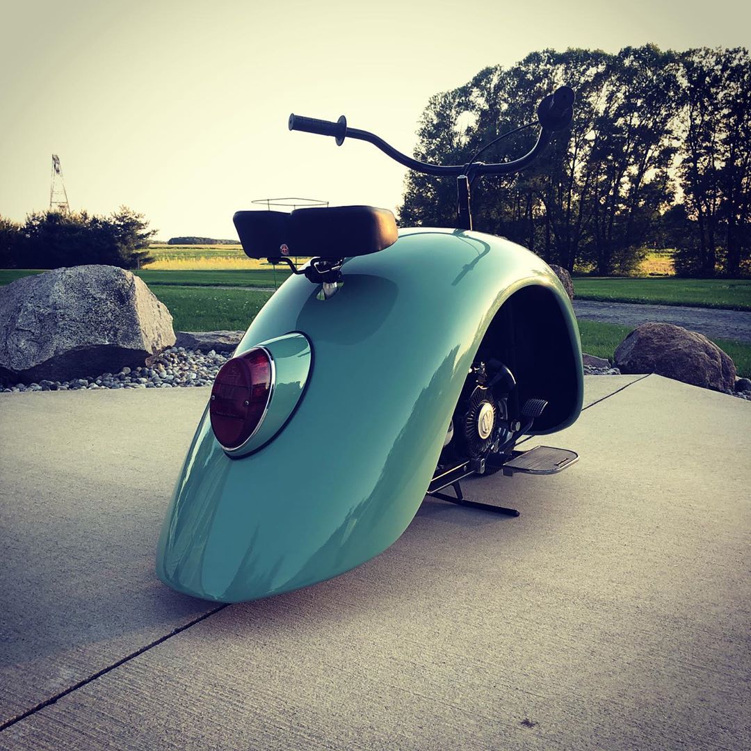 Handcrafted by Walter, the Volkspod is the name given to a hip two-wheeled creation birthed by sacrificing four Volkswagen Beetle fenders to the moped gods. The bulbous pair of motorbikes are constructed via countless hours of welding and metal shaping over top of a hand-built frame.