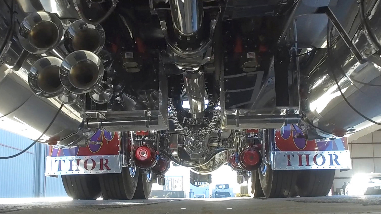 The result is 3,424 hp at 2,500 rpm, which goes through an Allison HT740 transmission with a locker-type differential at the rear axle. While engineering Thor24, Harrah had to rework the suspension since the stock setup from the original Peterbilt truck didn’t work. As a fix, he swapped it with an A-arm type front suspension from a VanHool coach bus.