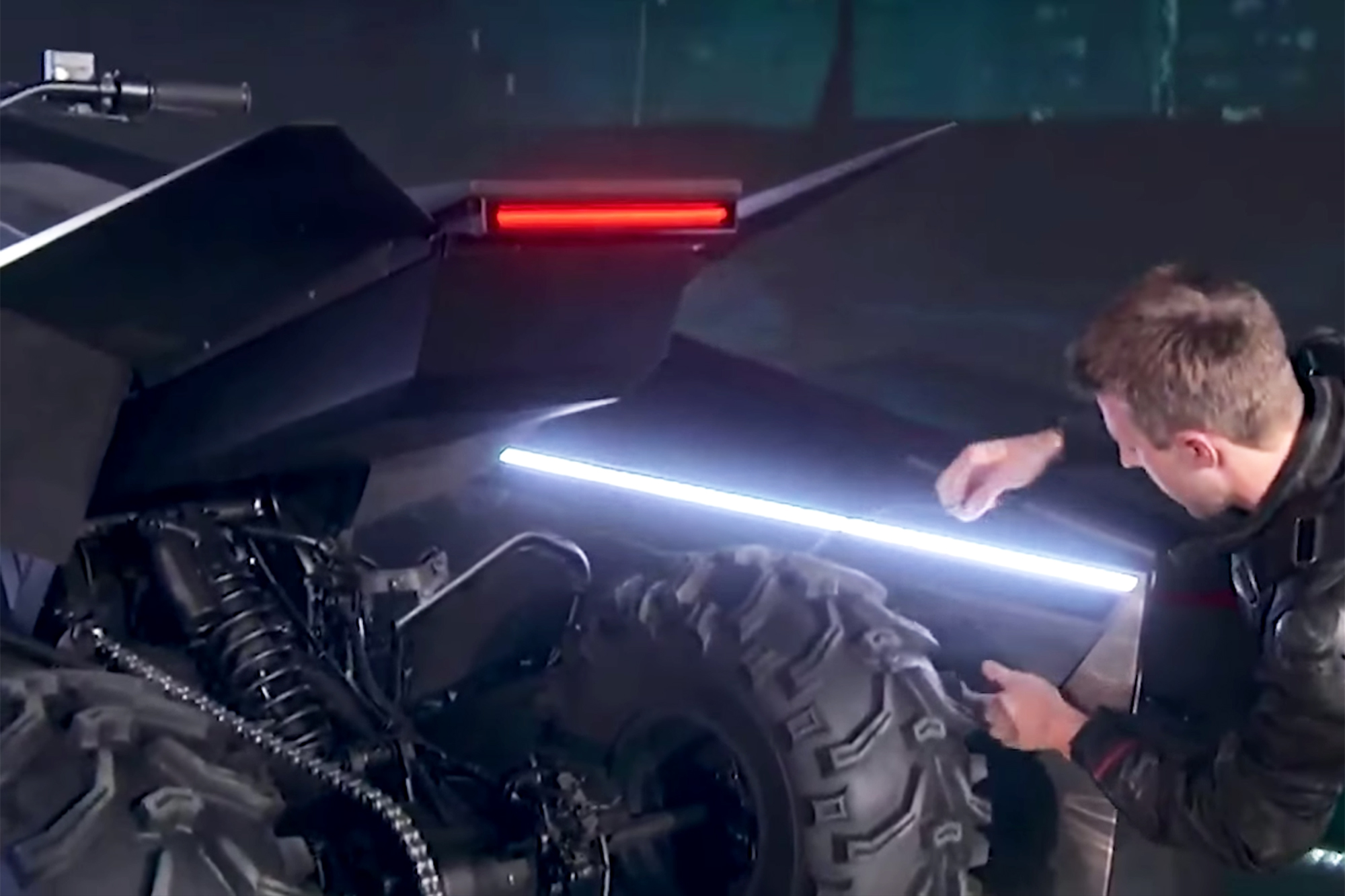 Though the prototype shown on stage was entirely blacked out, the livestream’s multiple camera angles and a few photos from the reveal afterparty afforded good views with which we can glean some early details. Compared to the Tesla Cybertruck, the Cyberquad has a fairly conventional design that copies the usual sport ATV profile with a tesseract-like flourish. Similarly, the dual front/monoshock rear suspension setup and rear-axle chain drive are par for the course for today’s gas-burning ATVs.