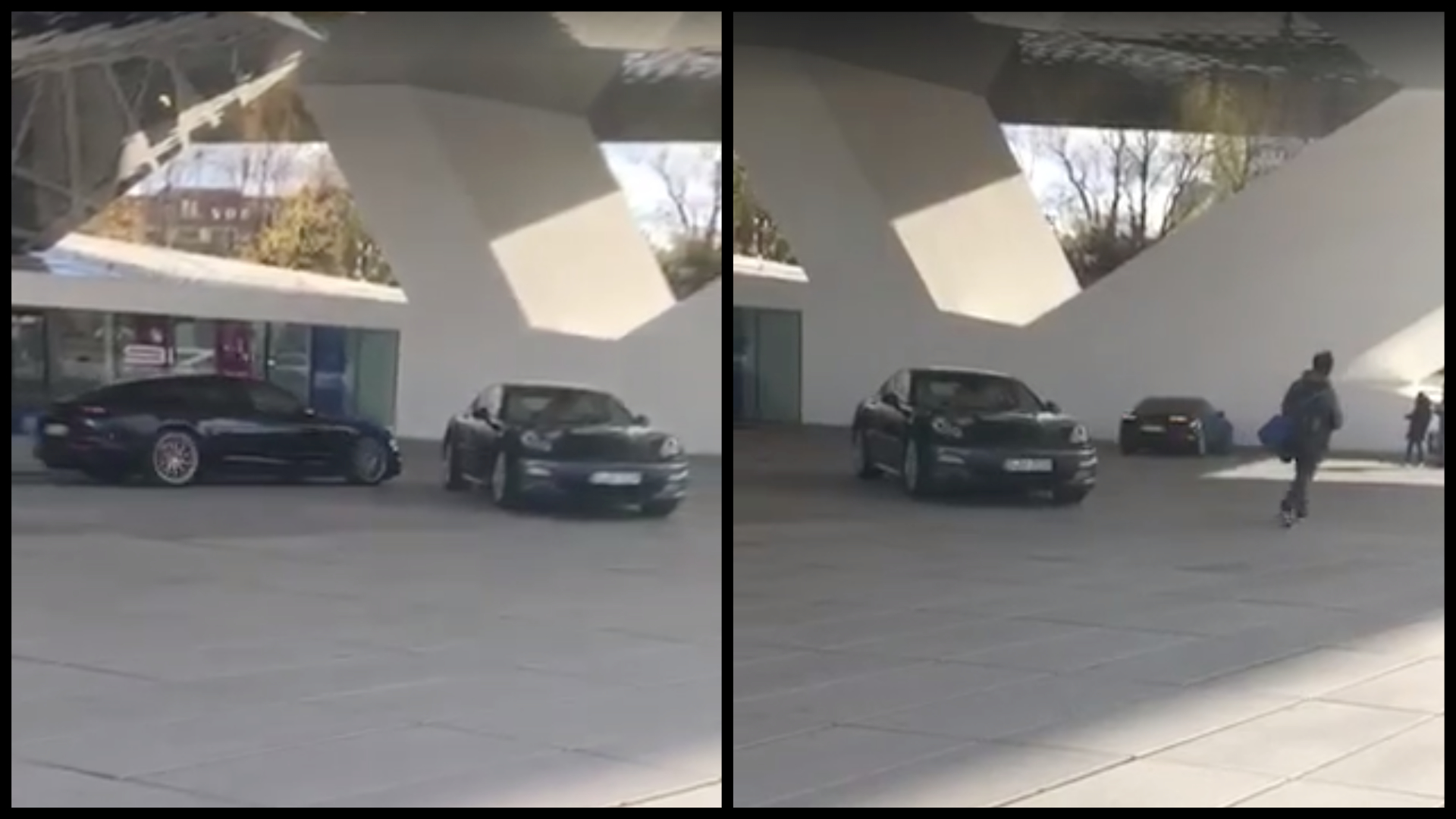 Porsche is currently investigating whether this odd crash was due to operator error while parking the car. There were no injuries, aside from maybe the photographer’s ego.