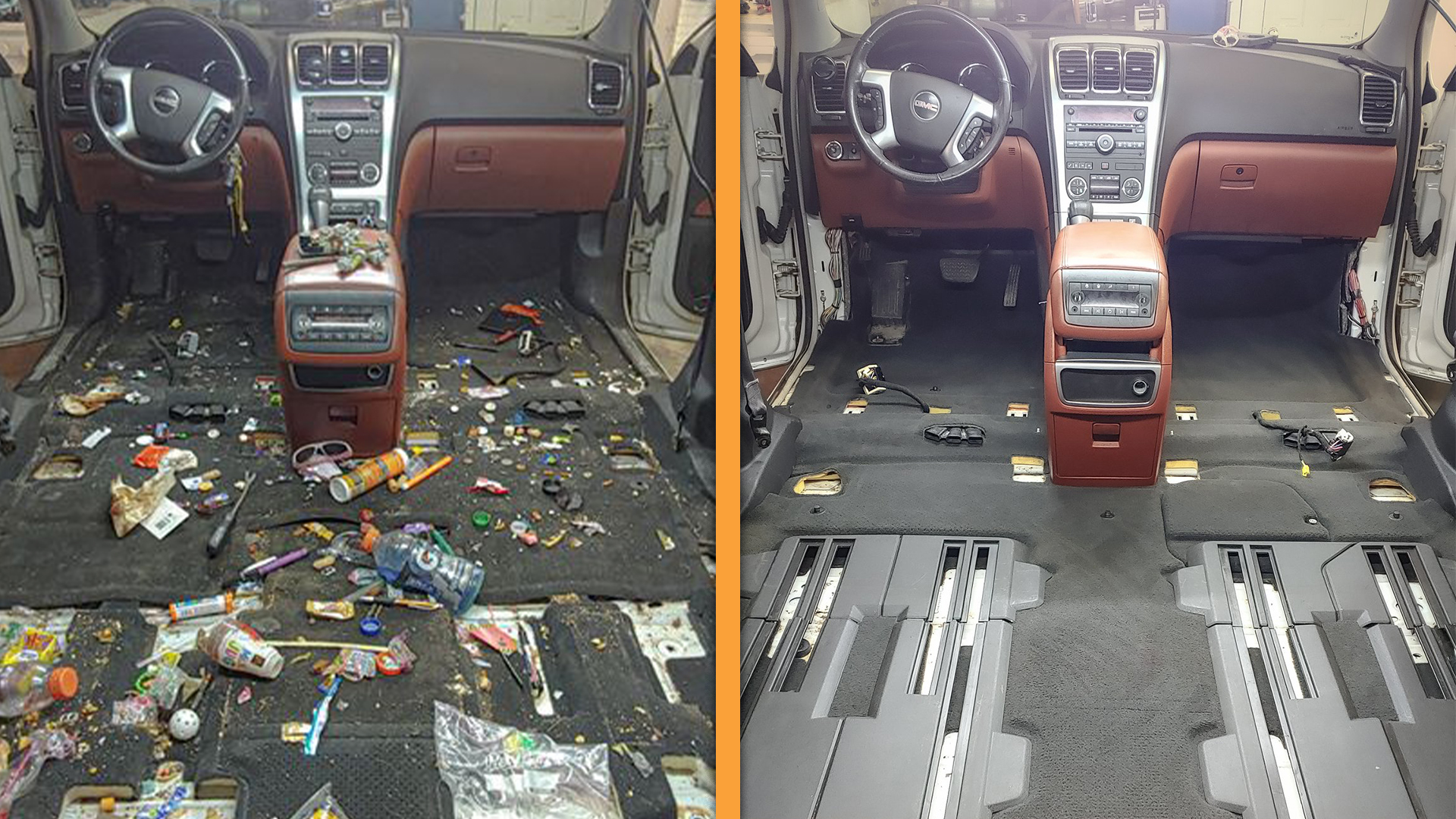 Brought into Showroom Details, an automotive detailing outfit out of Markesan, Wisconsin, the Acadia could be mistaken for Kabul, the great floating trash pile in the Pacific Ocean, our DMs and mentions, or a toxic waste dump. With the seats removed, there’s all manner of food products, trashed and crumpled containers and wrappers, McDonald’s toys, a Wiffle ball, an errant screwdriver, sunglasses, a couple of dollars in lost change, crayons, pens, pencils, hair ties, and used napkins of unknown vintage. *shudder