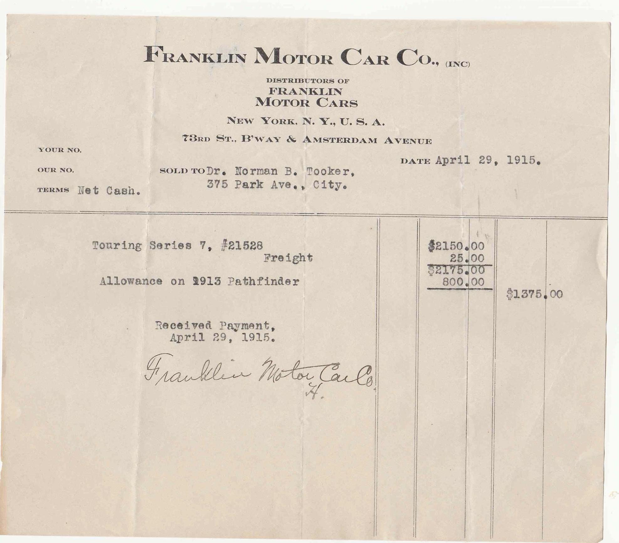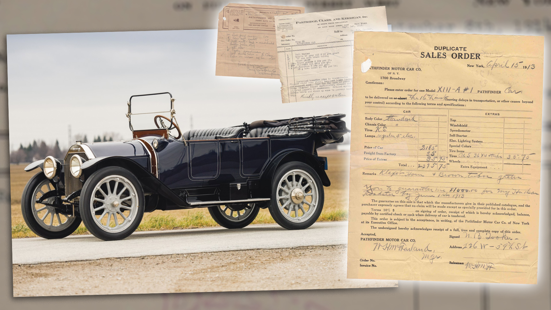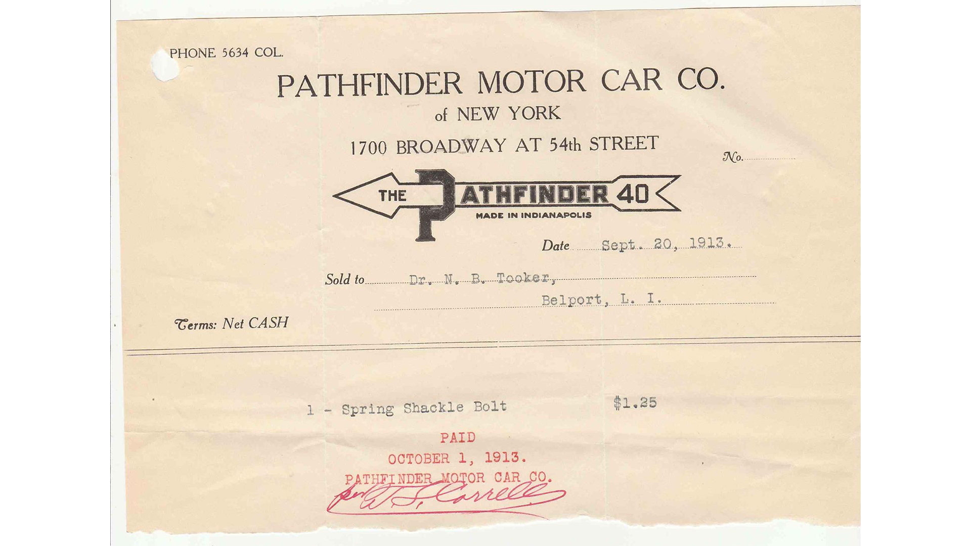 One of the earliest receipts is from buying a 1913 Pathfinder Series X111-A for $2,275.75 on April 15, 1913 in New York City, where Tooker lived. He would’ve been in his early 30s at the time, and adjusted for inflation, the car set him back over $58,000. Pathfinder Motor Car Company was birthed from the failed Parry Auto Company in 1912, and it was known for producing Brass-Era automobiles with superb reliability. It routinely tested itself with cross-country treks, similar to modern-day Cannonballers. But it only lasted until 1917 when World War I kneecapped Pathfinder’s chief market: Russia.