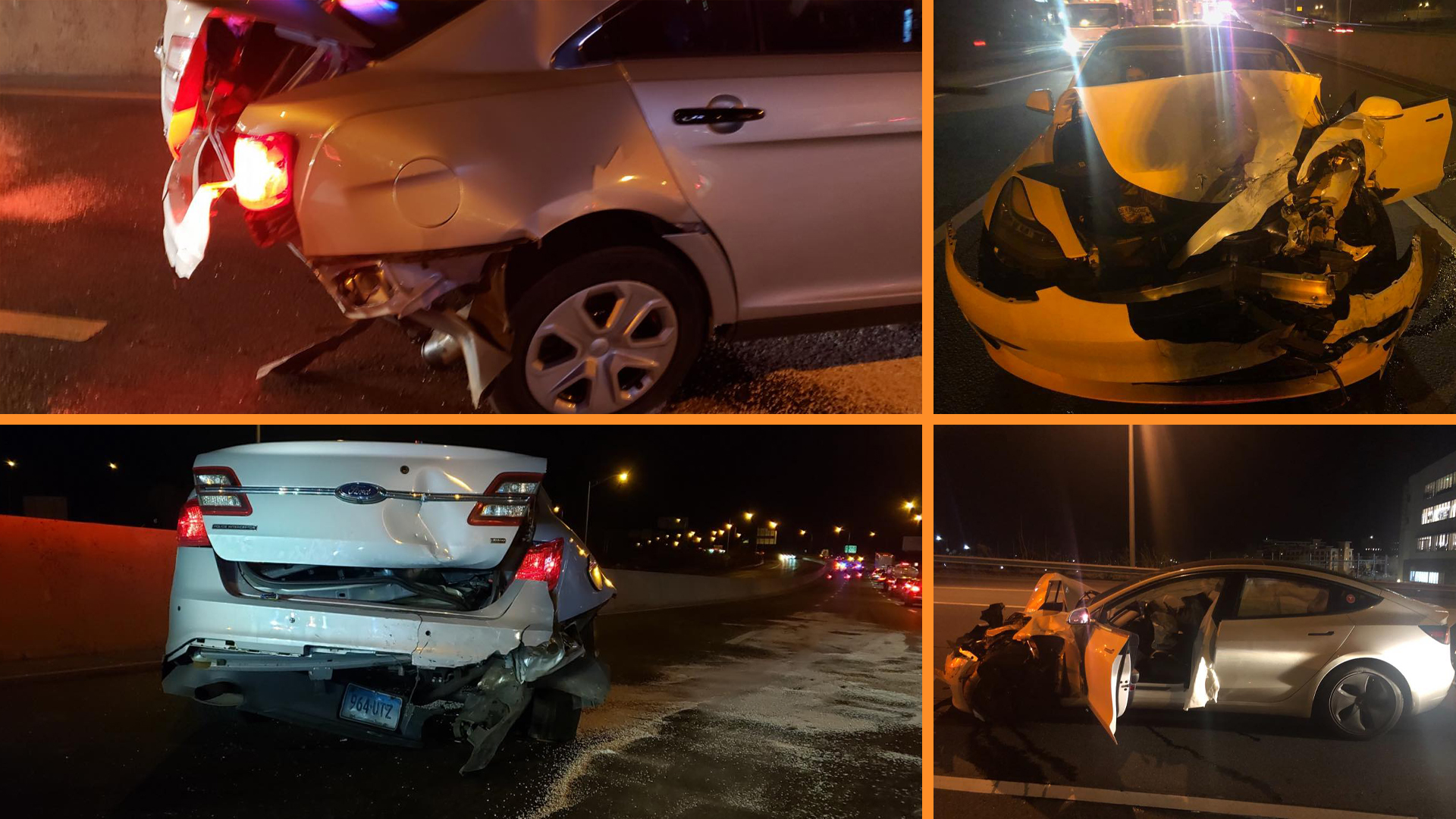 The accident took place early Saturday morning when the Tesla with Connecticut plates reading “MODEL3” was traveling northbound on Interstate 95. The electric vehicle struck a CSP Ford Taurus Police Interceptor in the city of Norwalk, where an officer was tending to a broken-down vehicle in the left-center lane of the interstate with the lights activated and flares placed before the scene.