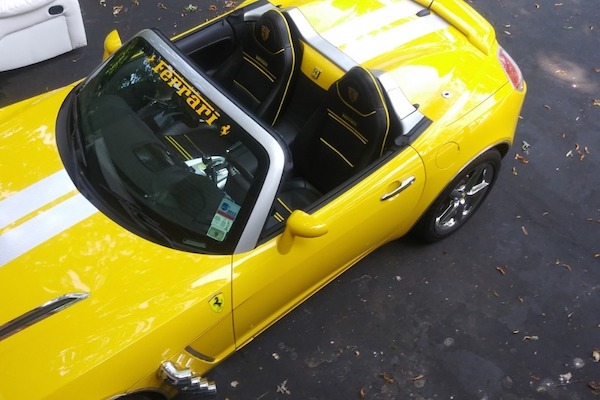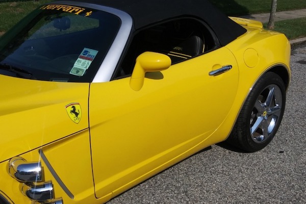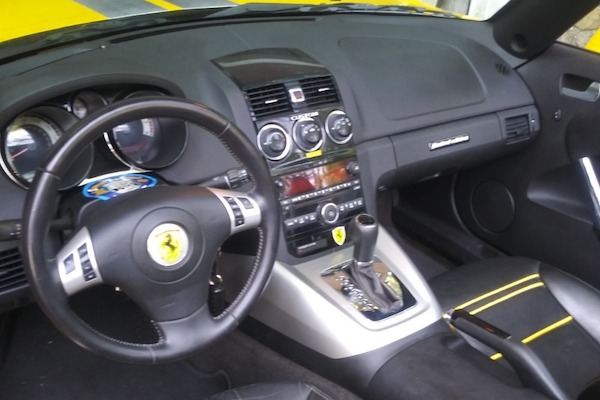 It gets worse when you begin noticing the numerous Ferrari badges slapped onto seemingly every flat surface. Assuming the owner applied the Prancing Horse and other Ferrari motifs symmetrically on both sides of the car, we count 14 such logos, which is 14 too many for a car engineered entirely by GM. Five of them can be found on the car’s interior, which reveals another sad secret about this would-be Disney princess: it’s an automatic.