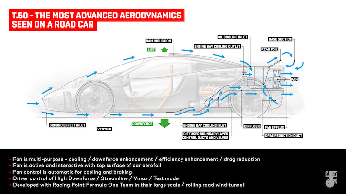 In the corners, there may not be any street-legal car capable of keeping pace with the T.50, as Murray says it “will have the most advanced and most effective aerodynamics ever seen on a road car.” He refers, of course, to the combination of active aerofoils and a 16-inch fan that sucks air from underneath the T.50, pulling it to the tarmac. Murray designed a similar system for the 1978 Brabham BT46B Formula 1 car, which was banned after one race, and that should tell you everything you need to know about how the T.50 will corner.