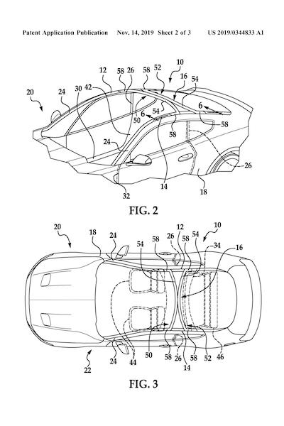 While one’s eye is first drawn to the illustrated Mustang’s vast windshield, which would extend over the heads of the front-row occupants, the patent’s abstract description is more concerned with how to make such a windshield possible. Ford’s proposition is a pair of sturdy roof rails, joined crosswise by two opposing bows, which reinforce both rails and facilitate load-sharing between the structures in the event of an impact, such as being T-boned or a rollover. This assembly, Ford says, could be concealed by a small metal panel in the roof.
