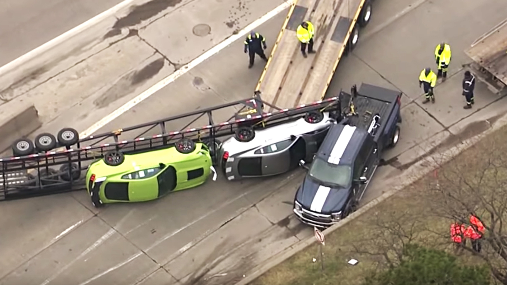 Fox 2 Detroit reports the Ford F-350 hauling the long three-axle trailer spun out as it was descending a long, curved ramp in downtown Detroit connecting two sections of I-75, the Fisher Freeway and the Chrysler Freeway. The rig jackknifed, which in turn set the trailer and the two GT500s on their sides. Whoever strapped them down clearly did an excellent job, but body damage on the Iconic Silver model is visible where it crunched into the F-350. The Grabber Lime car looks to have left a long scrape along the pavement, but it’s hard to tell how bad things are from the helicopter shots.