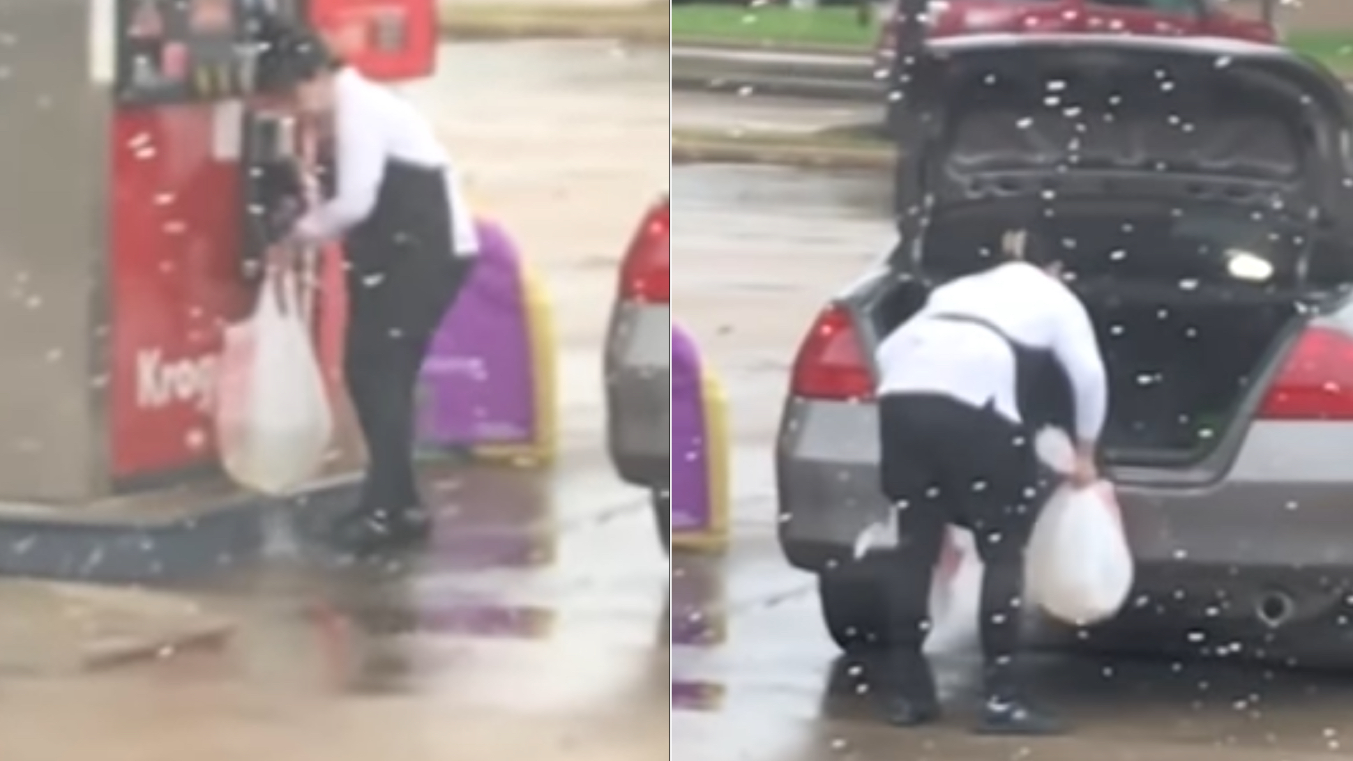 One catch: Gasoline is heavy! Naturally, this led to a blowout of the woman’s first bag, spilling fuel all around the pump. That’s when she double-bagged the first bag anyway and put it in her Honda Accord’s trunk.