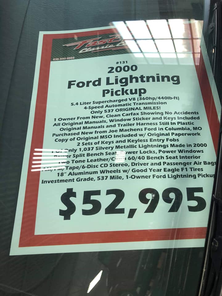 Not to worry, because it’s even more expensive now two decades down the line. While the dealer’s website doesn’t list a specific price, up-close-and-personal photos posted to a Ford Lightning Facebook group reveal a sticker price of $52,995. At around five times as expensive as most examples found for sale online, albeit with at least 100,000 fewer miles, this is certainly a big pill to swallow. Yet again, that kind of money will get you a fairly common 2020 F-150 Lariat with at least another 10 grand needed if you want a top-trim Platinum model.