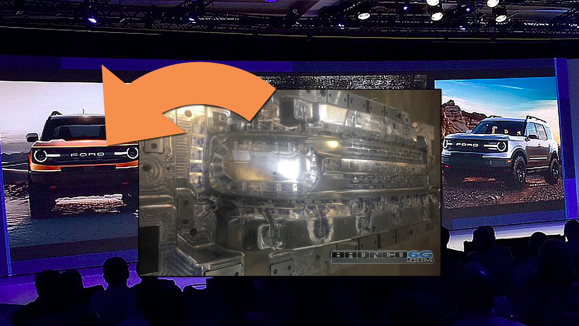 Looking at the headlight assembly shown on Monday, one can immediately differentiate between the circular pattern of the original leaked part and this new grille which features a more oval design. However, look towards the center of the part and see that the Bronco branding is displayed across the midline.