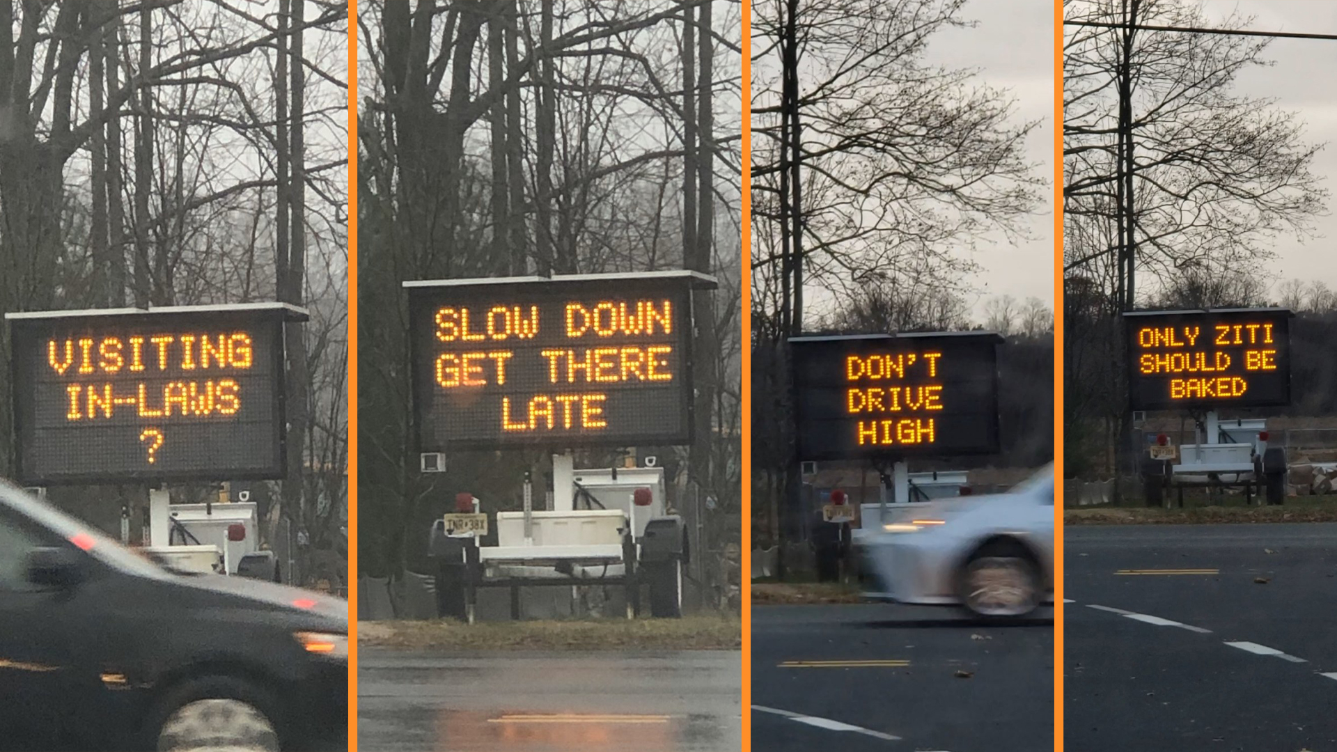 “Don’t drive high, only Ziti should be baked,” Nitti said of another note shown on a digital sign in his town. “It’s rolling on and we’re under pressure to find the next one.”