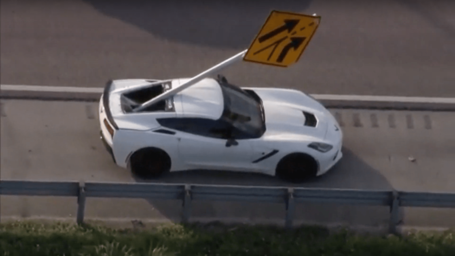 Investigators said the sign normally indicates the location of the on-ramp merge from Pembroke Road and it’s possible that the preceding accident caused the sign to fly up in the air, ultimately landing in the Corvette in a case of unfortunate timing.