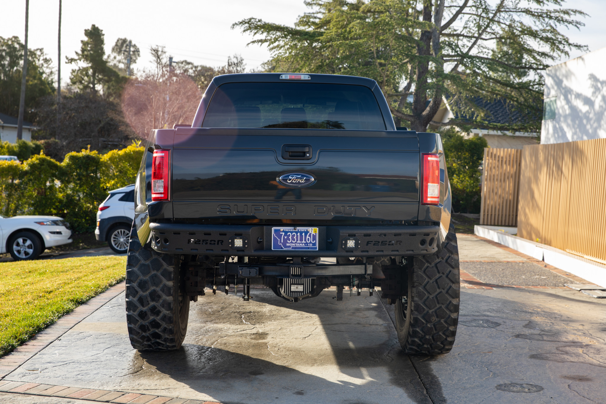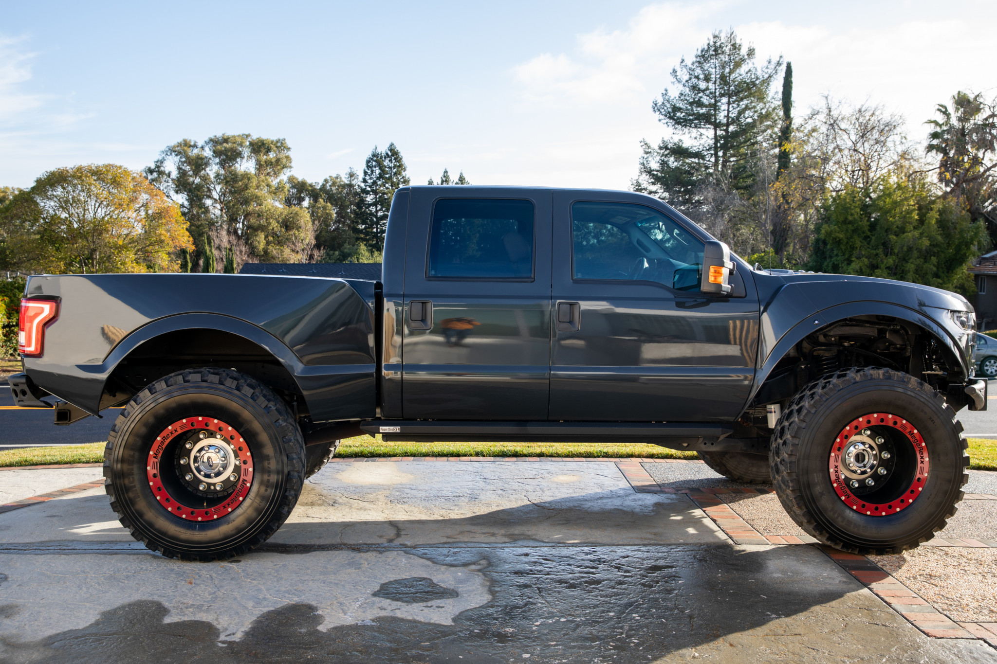 Off the bat, it’s clear that this pickup is an amalgamation of beefed-up components. MegaRexx Trucks of Tucson, Arizona equipped the Super Duty with a Raptor-style front fascia, although the panels are now made of fiberglass and expose the hood in clamshell fashion. The bedside fender flares are also fiberglass, and they allow plenty of extra room for those monstrous Michelins that wrap around 20-inch, 10-lug beadlock wheels.