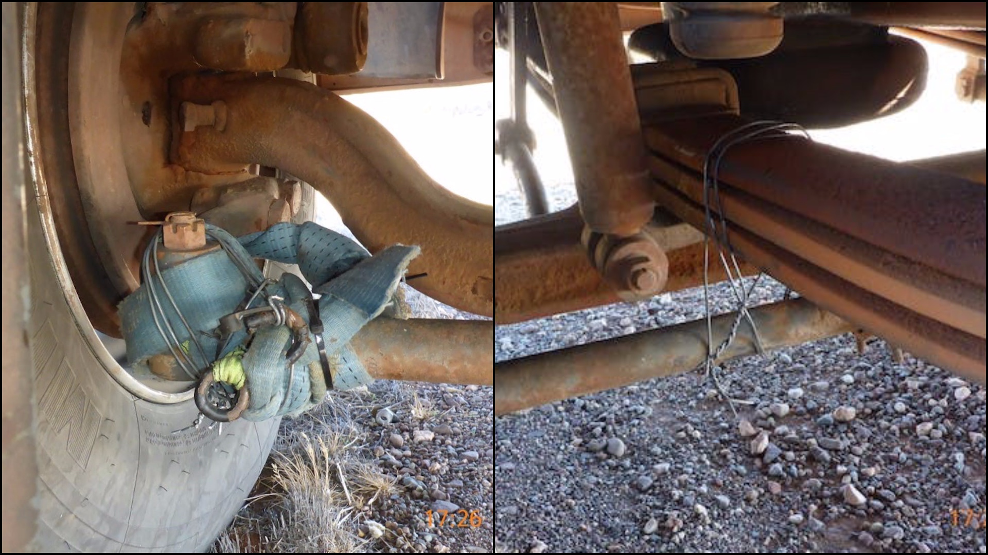 The truck’s suspension was in a similarly worrying state of neglect; its leaf springs wired to a suspension component that shouldn’t be dangling loose (we’ve seen that before with the world’s worst custom exhaust). Presumably, the hanger visible just inches to the right of the wires has failed, potentially due to rust.