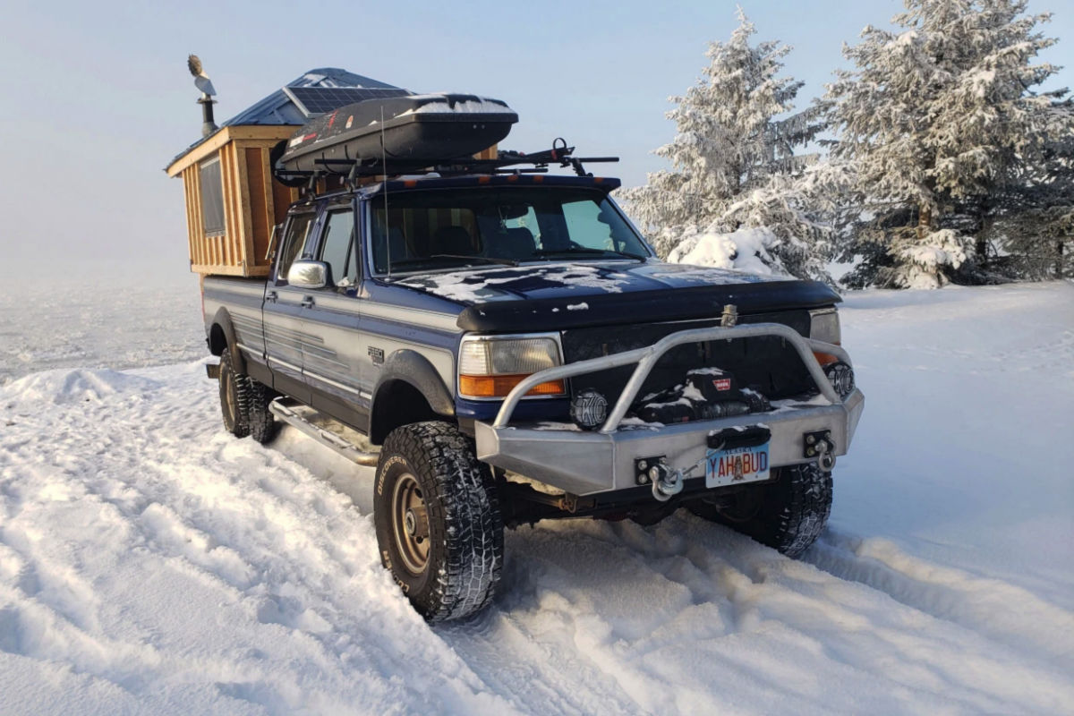 Despite what the internet might have you believe, some overlanders would rather pass on pricey, ready-built kits in favor of something DIY-centric. This means forgoing rooftop tents and already-assembled bed racks for a more bespoke project—in the case of Alaska man Tim Johnson, that means a small-scale log cabin in the back of his 1996 Ford F-350. And while some hardcore enthusiasts spend $50,000 or more while modifying their rigs, Johnston’s cost him just $26,000 with the truck included.