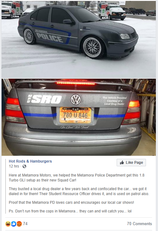 That’s exactly what the Metamora Police Department in Illinois did with this Silverstone Grey Jetta GLI. According to a Facebook post that has since been deleted, the VW was obtained by the cops a few years back in what was likely a drug bust. Instead of sending it to auction or, God forbid, the crusher, they decided to keep it around in case they found a use for it.