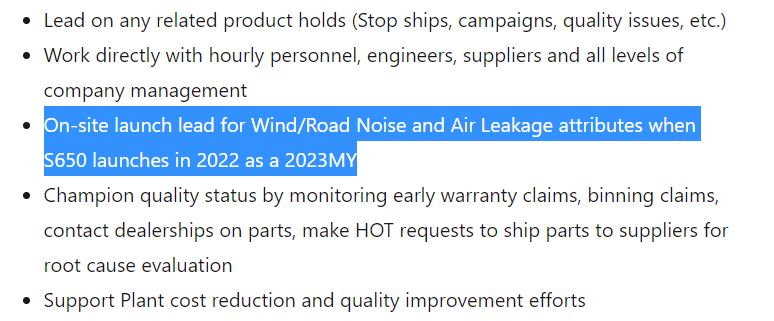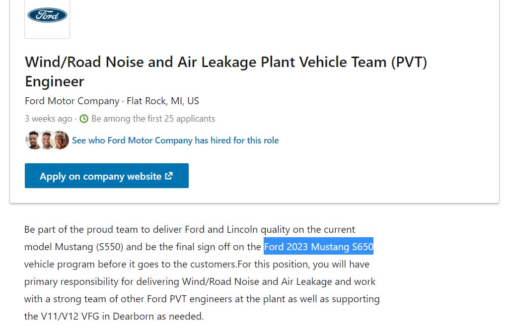 From the listing: “Be part of the proud team to deliver Ford and Lincoln quality on the current model Mustang (S550) and be the final sign off on the Ford 2023 Mustang S650 vehicle program before it goes to the customers.” If that didn’t spell things out clearly enough, one of the position’s bulleted responsibilities reads, “On-site launch lead for Wind/Road Noise and Air Leakage attributes when S650 launches in 2022 as a 2023MY.”