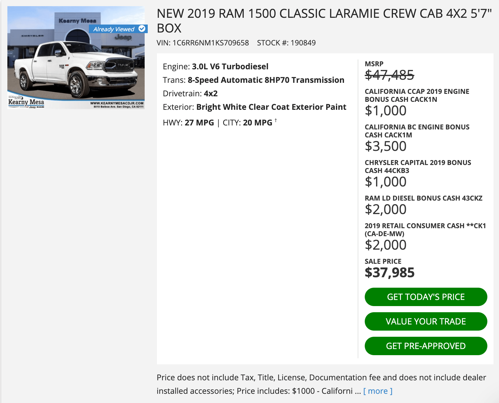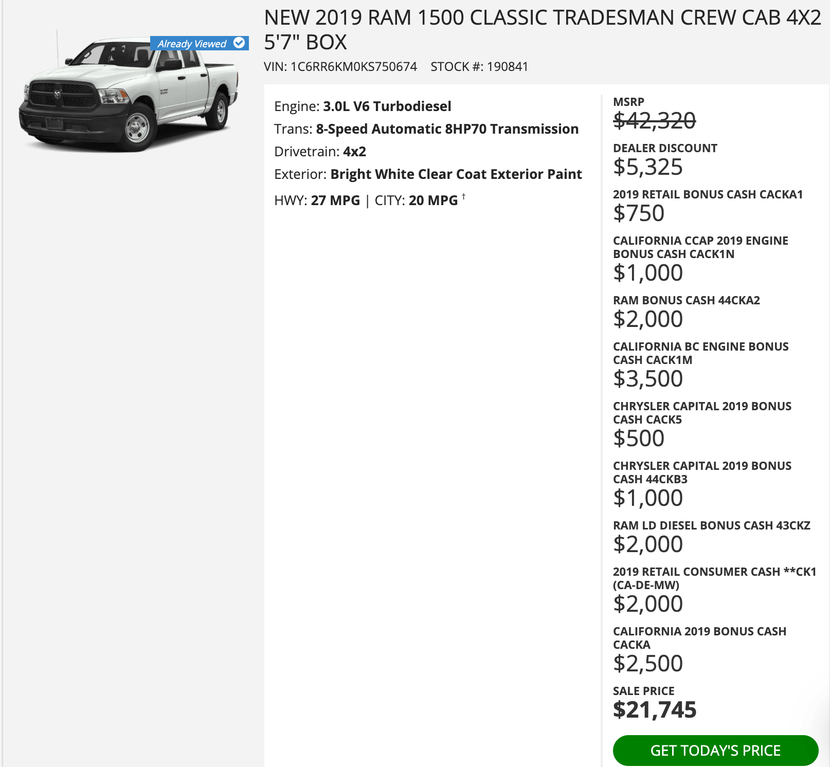As those at the CleanMPG forum recently pointed out, there’s an insane amount of incentives that drive down the prices of 4×2 Ram Classic EcoDiesels. Kearny Mesa Chrysler Dodge Jeep Ram in San Diego has a host of the trucks up for sale, its cheapest of which is listed at $21,745 with no less than 10 separate discounts contributing to that price. A healthy dealer incentive of $5,325 makes up a chunk of that, although the state of California also pitches in its fair share. Collectively, on this one Tradesman crew cab example, there’s an astonishing $20,575 taken off the MSRP.