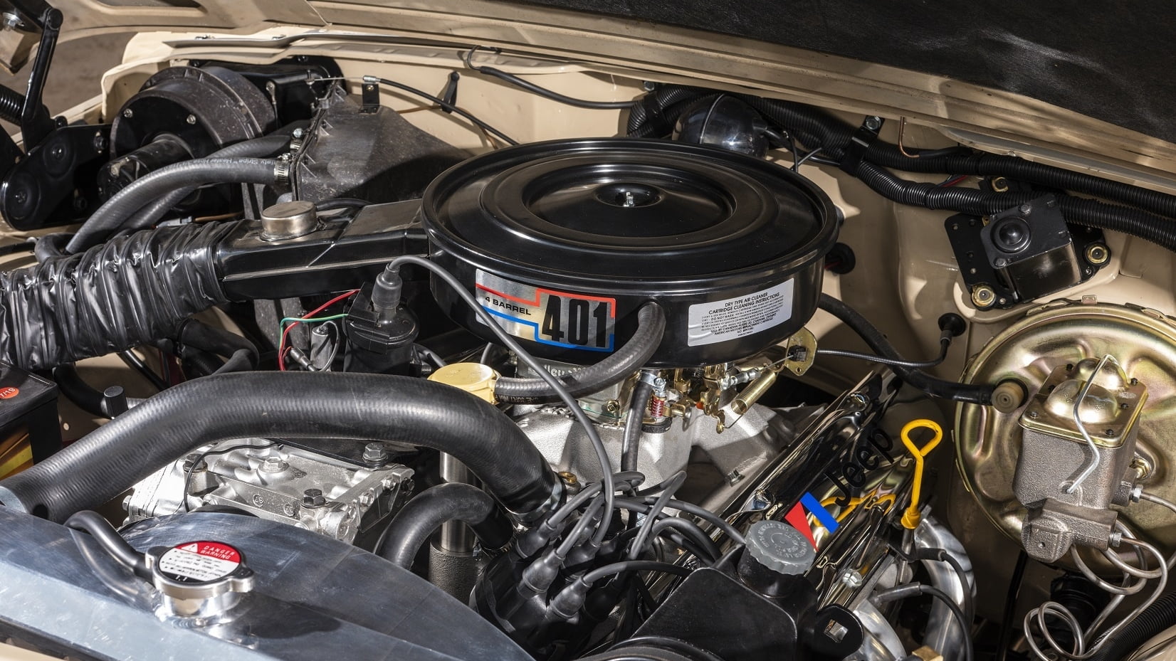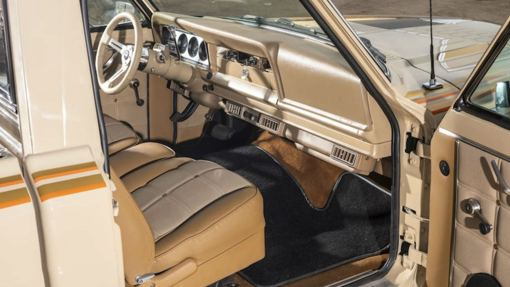 Under the hood is an AMC 401-cubic-inch V8, which sends power to all four wheels all the time via a period-correct Quadra-Trac system. A GM Turbo 400 automatic manages all that small-block grunt, which totaled 225 horsepower and 320 pound-feet of torque in stock form. This truck received upgraded aluminum heads and manifolds during a recent restoration, though, so expect that number to be a bit higher now.
