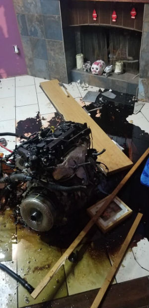 Perhaps the most daunting of all the photos is one which shows the Jaguar’s air conditioning condenser laying on the apartment’s doormat, looking in at the engine which landed in the living room.
