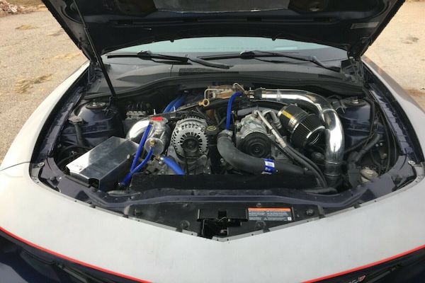 This fifth-generation Camaro started out as a 2011 SS model with a 6.2-liter L99 V8 engine up front, producing 400 horsepower and 410 pound-feet of torque. Presumably while using all those ponies, this Camaro was at some point crashed, destroying its hood, front bumper, right fender, and radiator support upon impact. While the seller says the unibody escaped damage, the Camaro was still stuck with a “rebuilt” title, meaning any residual value evaporated along with the coolant steaming from the radiator at the crash scene. With a perfectly good but worthless chassis, the owner did what we, the peanut gallery, would want them to do: Turn it into a project car with an over-the-top engine swap.