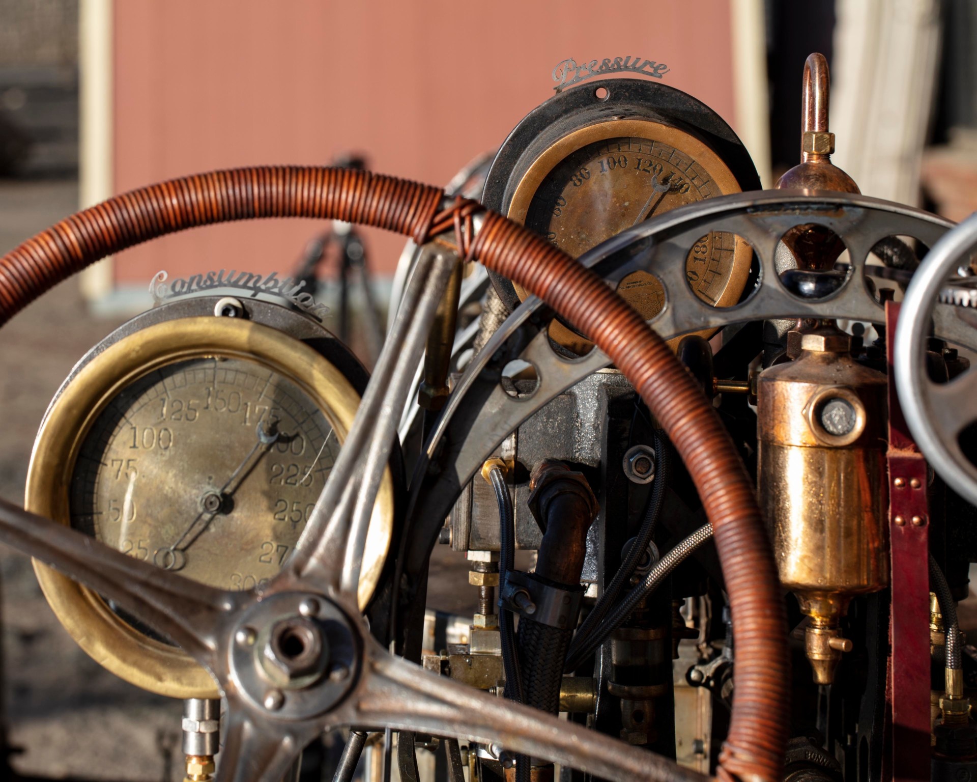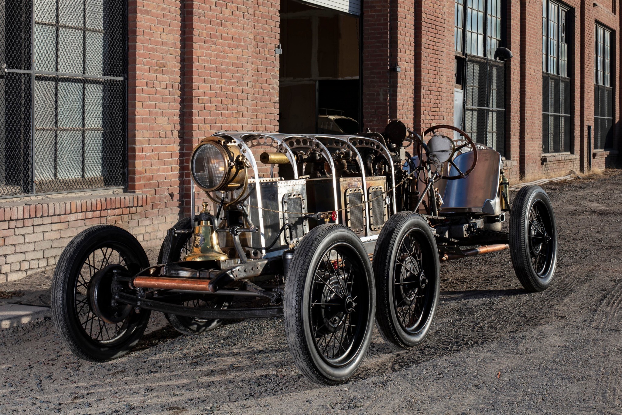 Copper and steel panels give the car a steampunk look (pun intended), as do all the exposed chains, two of which run to the back and power the rear wheels directly. The driver straddles these chains and uses a handbrake to control the single Model A drum that takes on the courageous effort of stopping the boattail roadster.