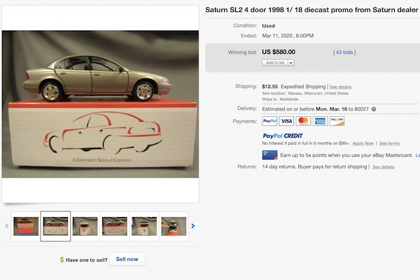 If diecast car collectors and diehard Saturn owners have one thing in common, it’s the ability to spend exorbitant sums on their respective hobbies. Model car collectors will justify any expense to expand their displays, and in the name of keeping their quaint cars on the road, Saturnists will do the same. One would assume overlap between these two groups is what fueled a recent eBay bidding war that resulted in a 1:18 scale 1998 Saturn SL2 die-cast model selling for nearly $600, which is more than you’d pay for a running, driving Saturn S-series.