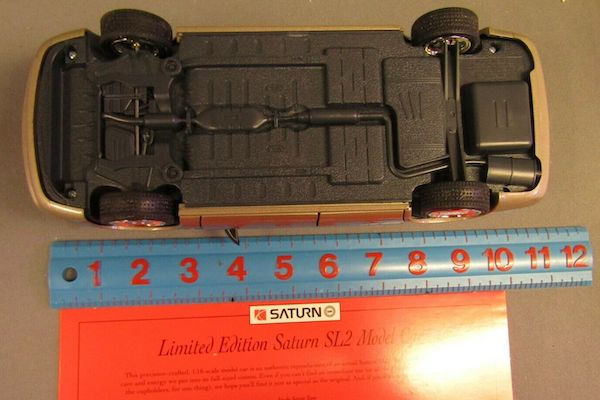 , jduranso on eBayBeing 1:18 scale models, these S-series came in at close to a foot in length, making them the perfect desk ornament for the Saturn enthusiast. Their bodies were painted in the same colors as their full-size brethren, and their hoods, trunks, and doors—skinned in plastic like the real deal—all opened to reveal detailed engine and interior castings. Even the SL2’s underbody was recreated faithfully in “post-industrial, recycled polymer from Saturn cars,” making this model just as much an oddity as the car that inspired it.