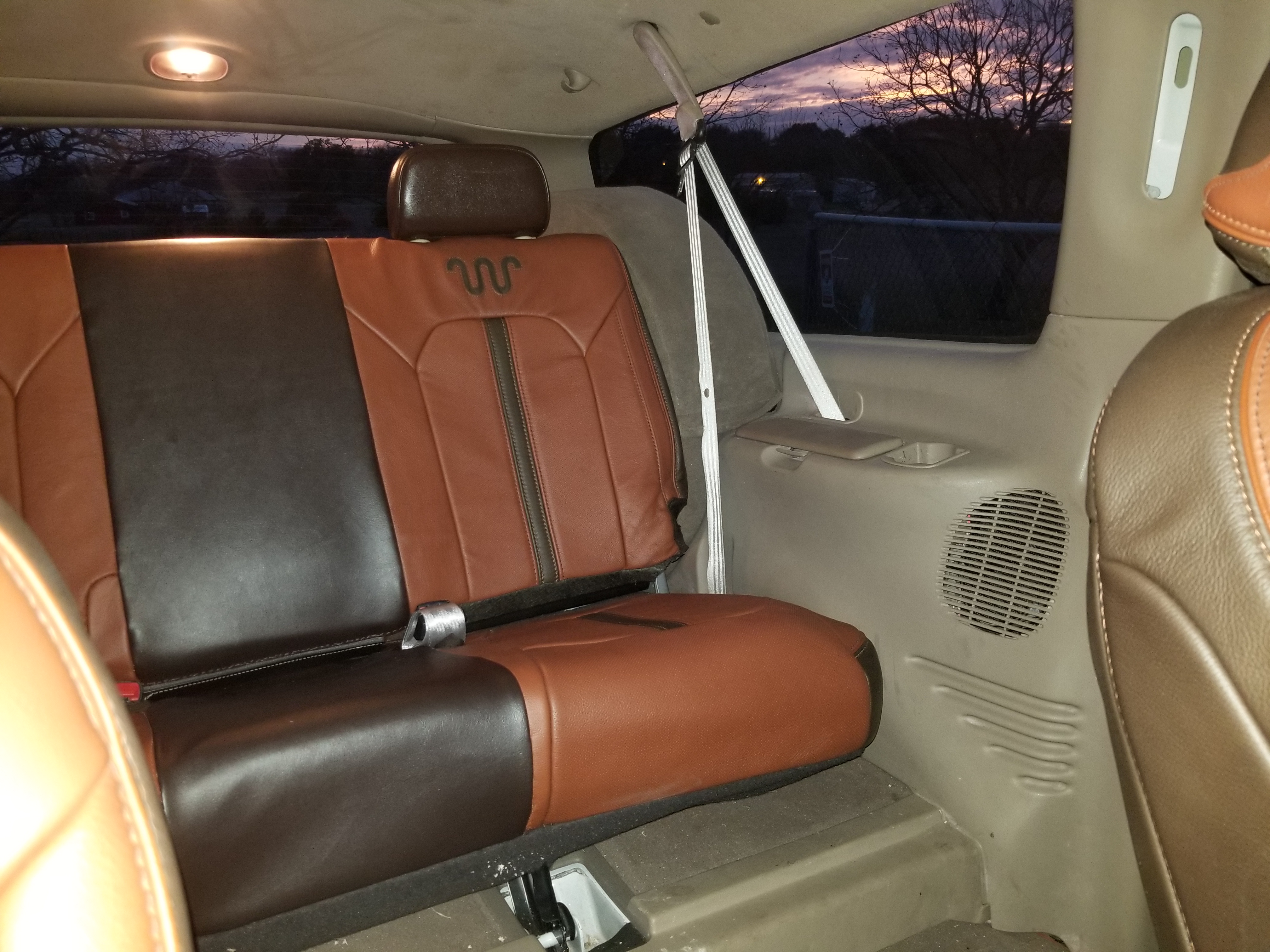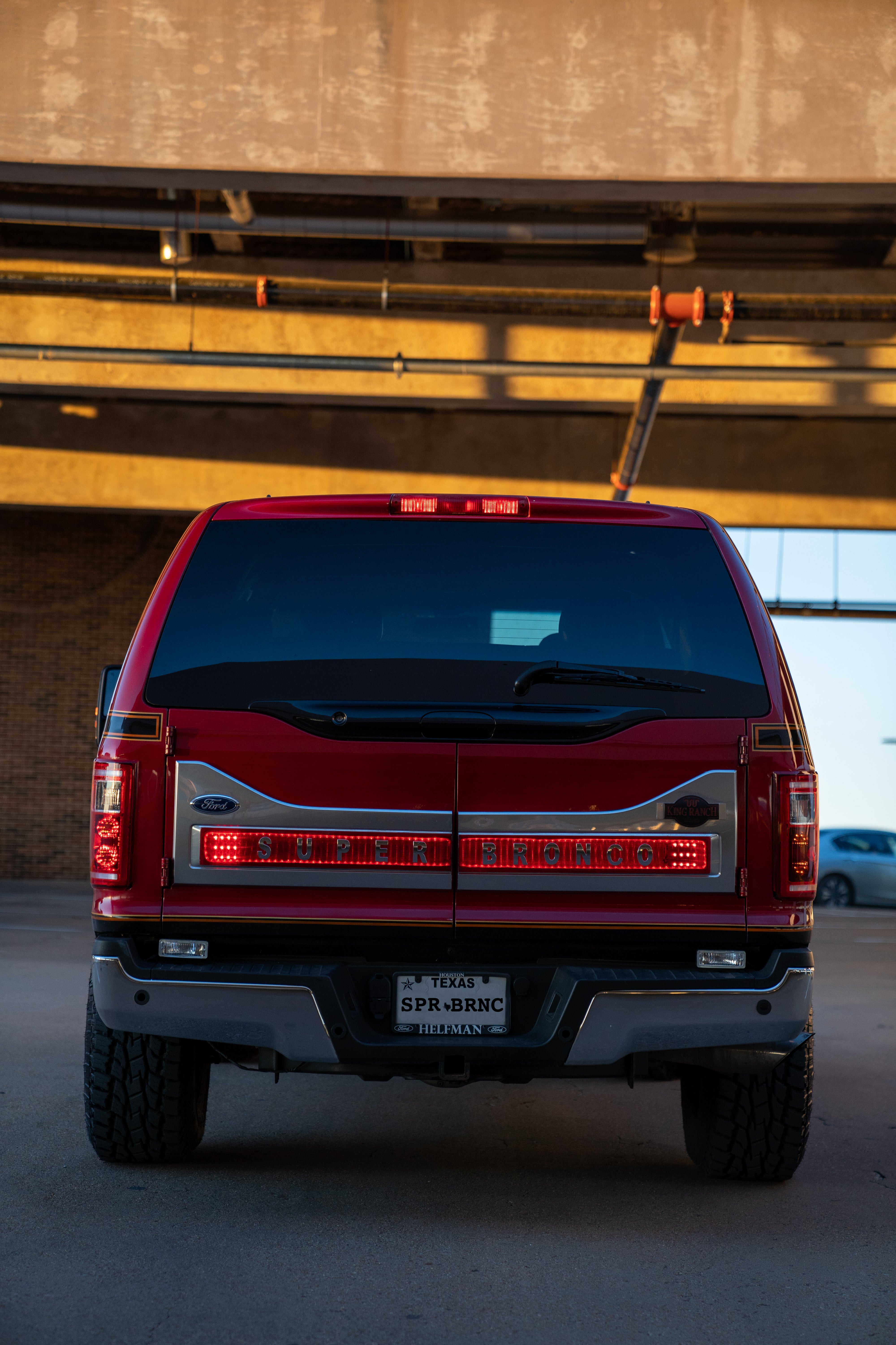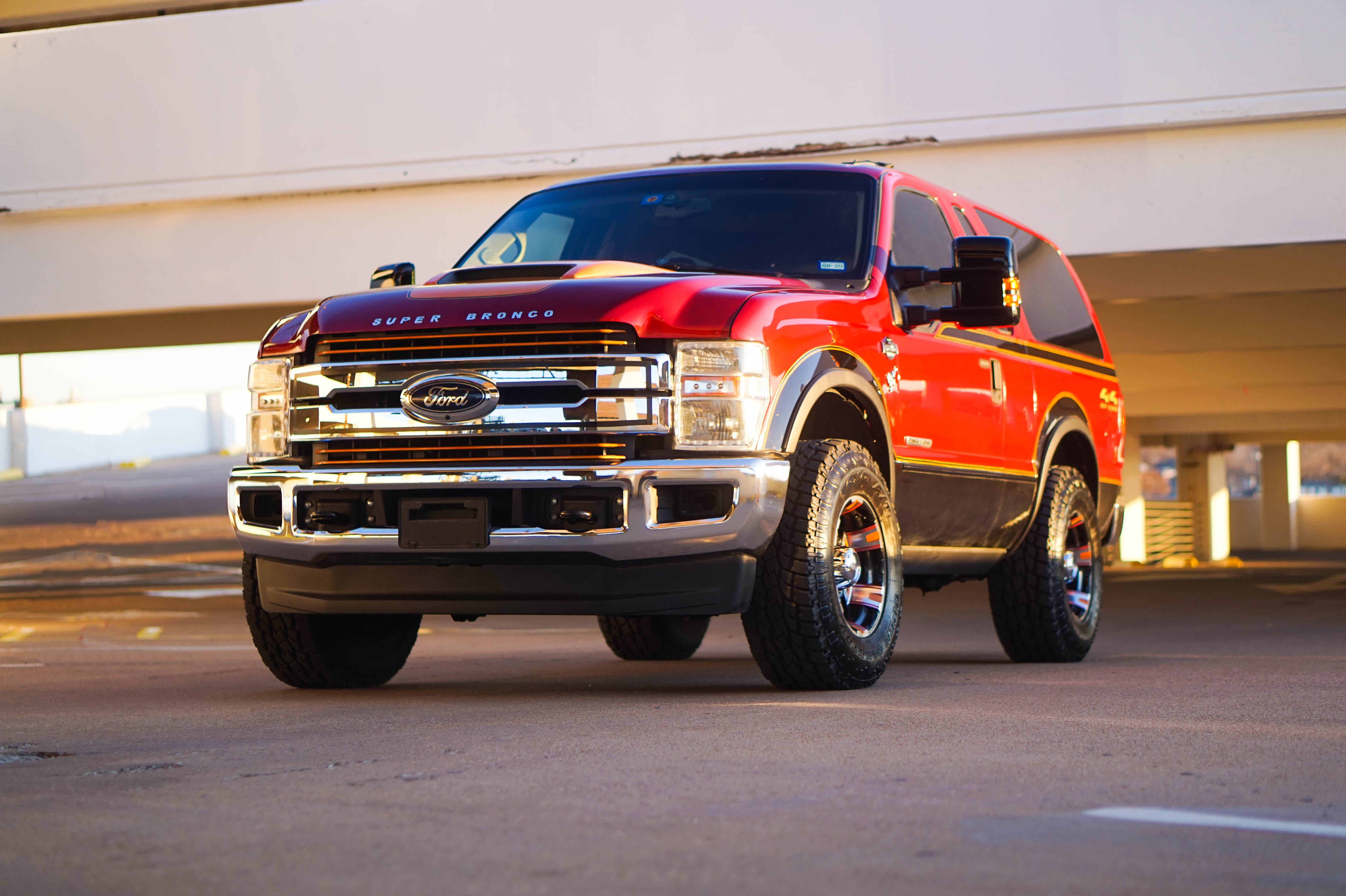 Toward the back, the Excursion body’s original taillights were removed in favor of 2017 F-150 units, though Stockman flipped them upside down for a stylistic flair. The tailgate couldn’t be left alone either as it now wears the plating from a modern King Ranch truck with an inlaid light showing custom “SUPER BRONCO” lettering across it.