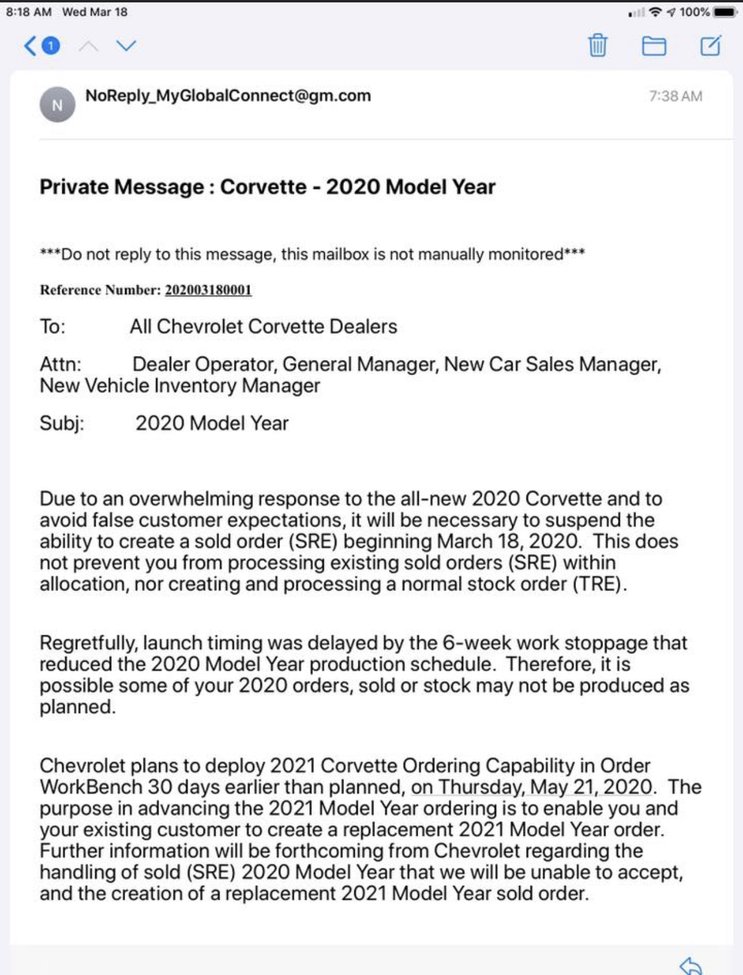 News broke via a leaked email on Corvette Forum which states that dealers would no longer create orders for model year 2020 Corvettes, effective immediately.