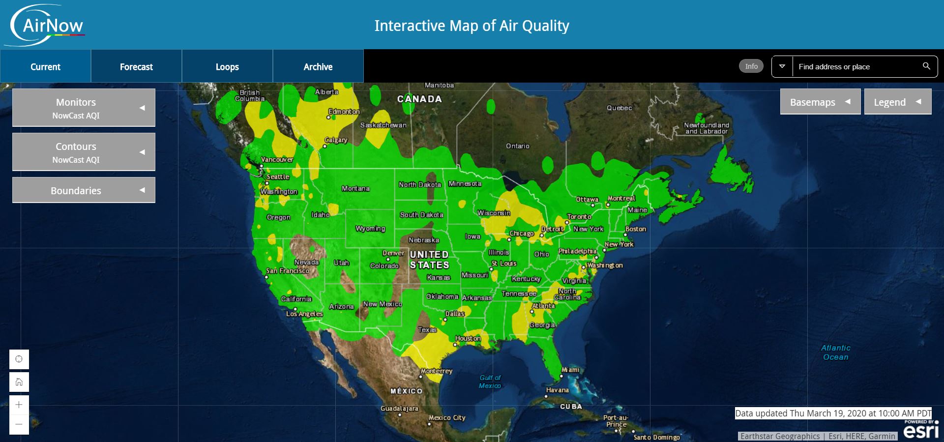 I live in LA, and I’ve witnessed that trend firsthand since the city went into voluntary quarantine. I’ve noticed I can breathe better, too. And air quality is improving across the United States. The national air quality tracking site, AirNow.gov, has been providing real-time data on the U.S.’s conditions and shows tangible evidence of how the reduction of cars on the road has improved the nation’s air which you can see below.