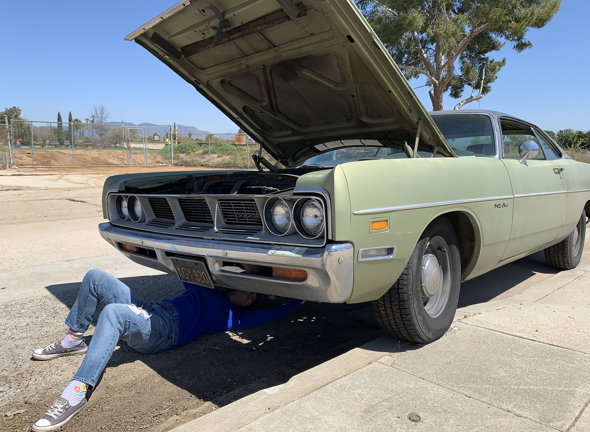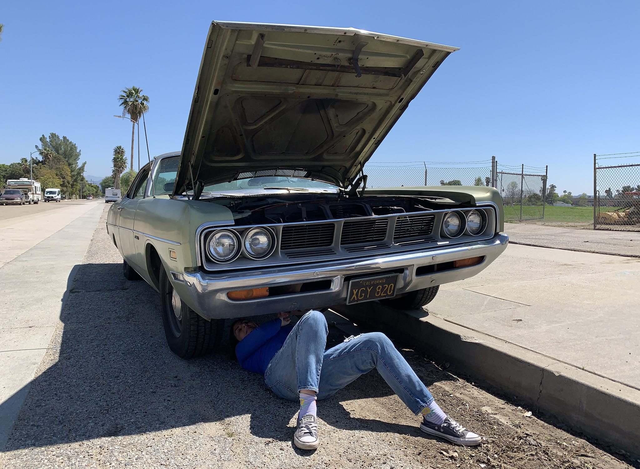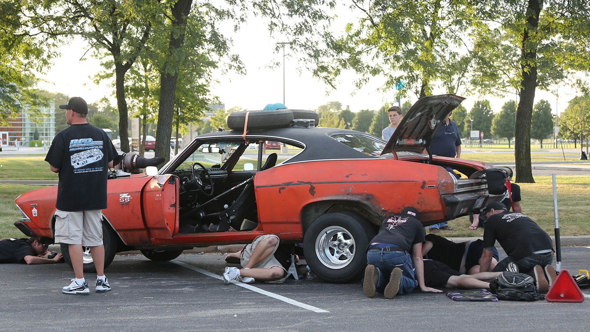 - Parking lots and parking garages! Especially now, while many things are closed, you could work behind a mall or office building with minimal disruption. Scope it out first. You don’t want to get halfway through and have to move. Auto parts stores are another place to work if you’re doing something quick like battery or belts. Officially, work in parts store lots is discouraged, but I’ve never been to Auto Zone when there wasn’t at least one person in the lot with the hood up. The biggest pro of working near a parts store is, duh, easy access to parts, and a place to dispose of fluids. If you’re going the parking lot route, be considerate about where you set-up and how much space you’re using. The less you’re in the way, the more likely you are to be able to finish without interruption. My last parking lot fix was in Sacramento, an ignition failure on a 1969 Dodge Charger…on the way to my brother’s wedding. We made it in time!