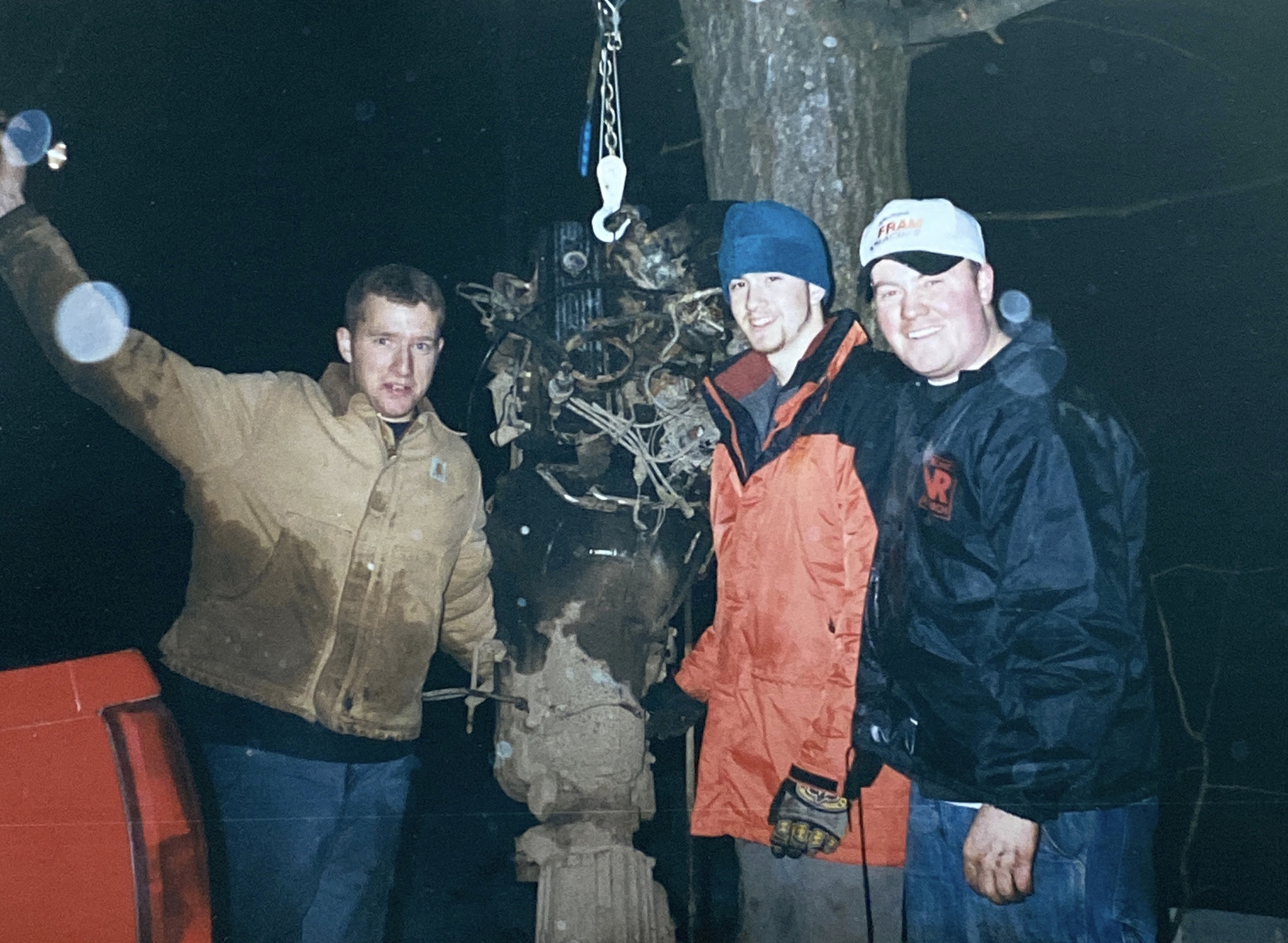 - In the woods. Pro: unlikely that anyone will report your activities. Also Pro: Trees available for helpful hoisting. Cons: Harder to keep parts clean. No electricity unless you bring a generator. Possible you’ll be eaten by wolves or a witch in a chicken-foot house. Seriously though, if you do work in the woods or a field or any natural area, be extra careful about jacking up your car on soft ground. Plywood comes in handy here, as do tarps. Heck, tarps always come in handy. If you’re working over dirt, you still need to be responsible regarding fluid spills. Think of the sweet baby wolves. Do you want them to get antifreeze poisoning? No, you do not. As a desert dweller, my own off-road fixes have been more about knocking sand out of clogged filters than mechanicking around in the forest, so I borrowed this photo from my friend Brian Lohnes to illustrate handy tree-hoisting. He says they stole this engine out of an abandoned truck. So why did you take a photo of the crime, Brian??