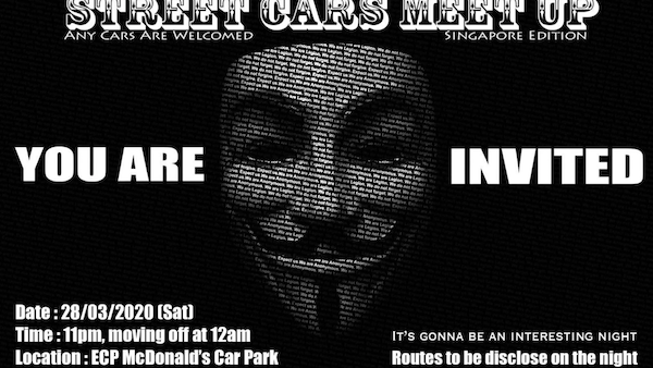 According to The Straits Times, 30-year-old Yeo Jing Cheng of Singapore is accused of organizing a car meet and street race that brought dozens of people out of social isolation for a “street cars meet up,” an invitation to which can be seen below. Cheng reportedly brought an unspecified number of people greater than 10 together in the parking lot of a McDonald’s near Singapore’s southeast coastline on the evening of March 28, two days after Singapore codified additional laws to limit the spread of COVID-19, some of them prohibiting social gatherings of more than 10 people.