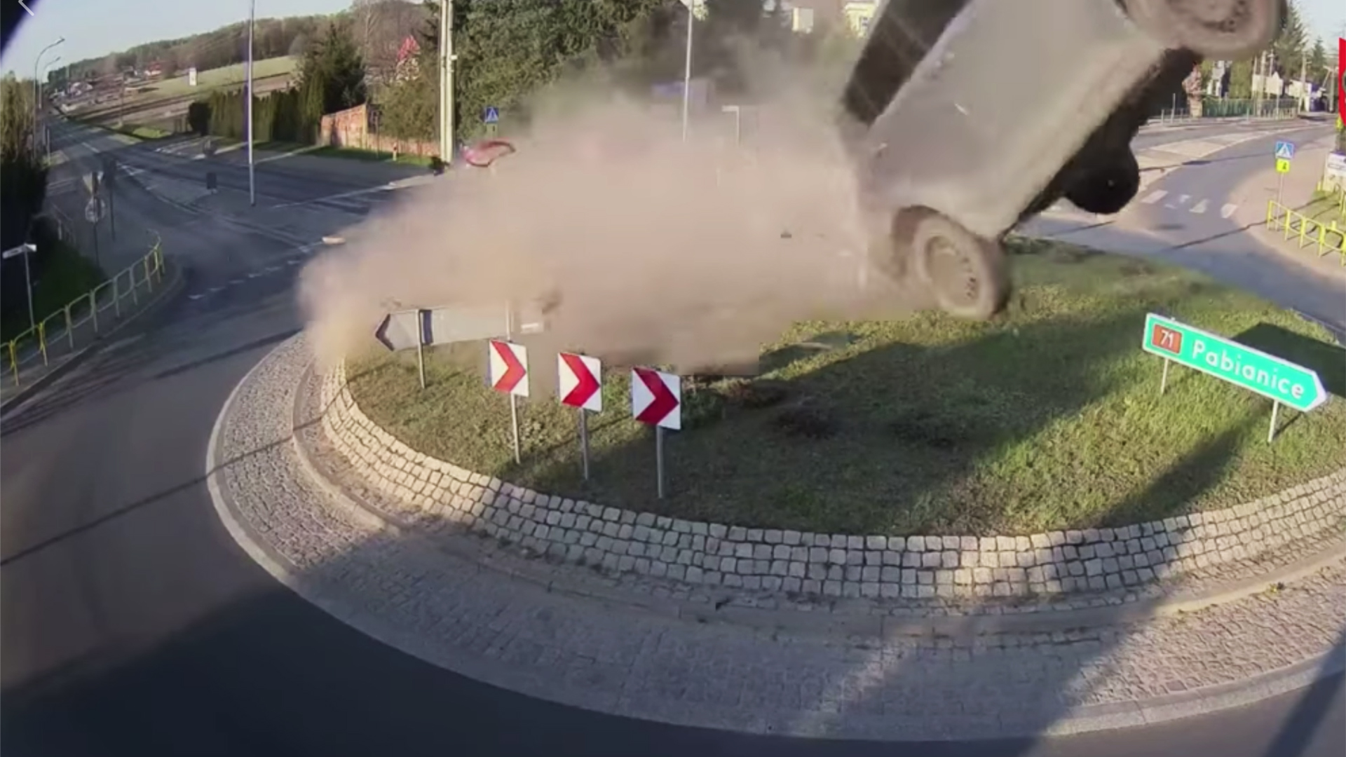 On Easter Sunday, the driver entered the roundabout at far too high a speed to stop or manage the turn in any way. The impact with the roundabout embankment sent the Suzuki Swift flying, and it appears to continue its ascent as it exits the video frame.